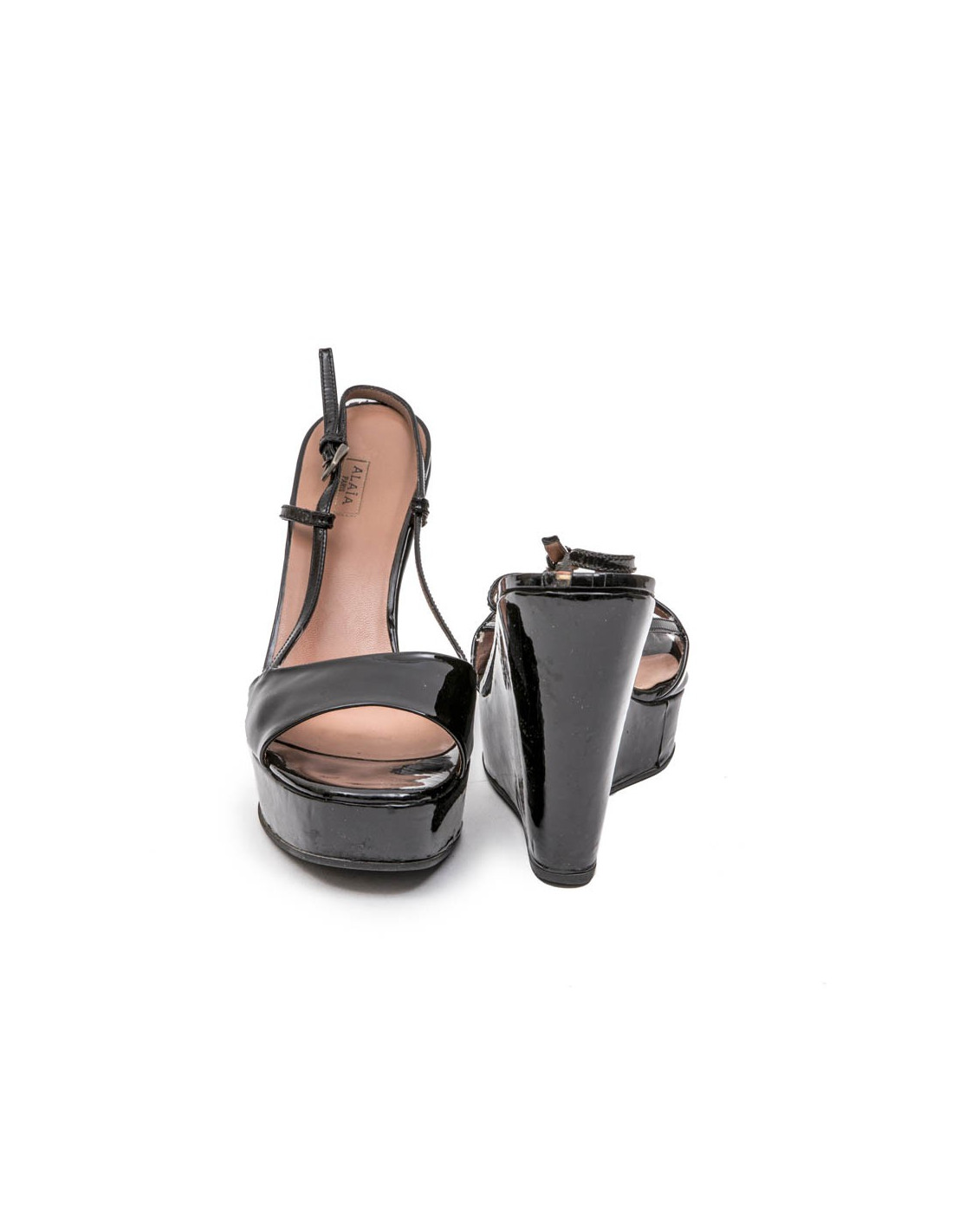 Sandales compensées Alaia en cuir verni noir. Taille 39.