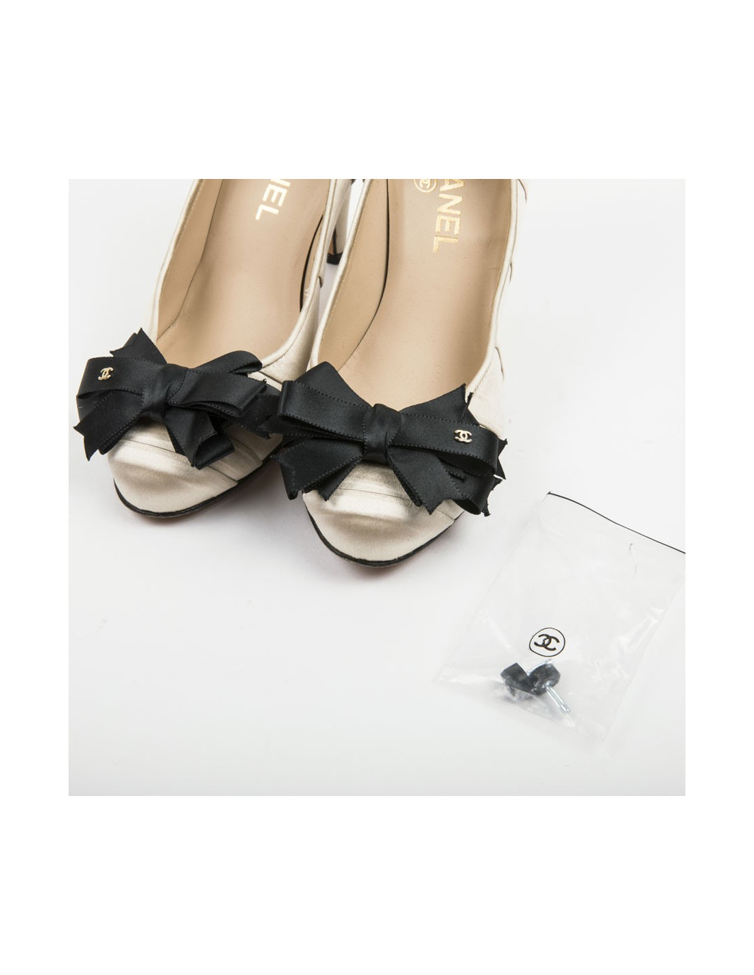 Escarpins Chanel en satin duchesse beige et noir. Noeud en satin noir avec sigle doré "CC". Talon en satin beige. Semelles extérieures et intérieures en cuir véritable. Made in Italy