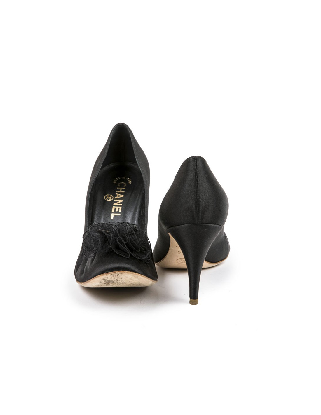 Escarpins T 38.5 CHANEL satin duchesse noir avec camélia