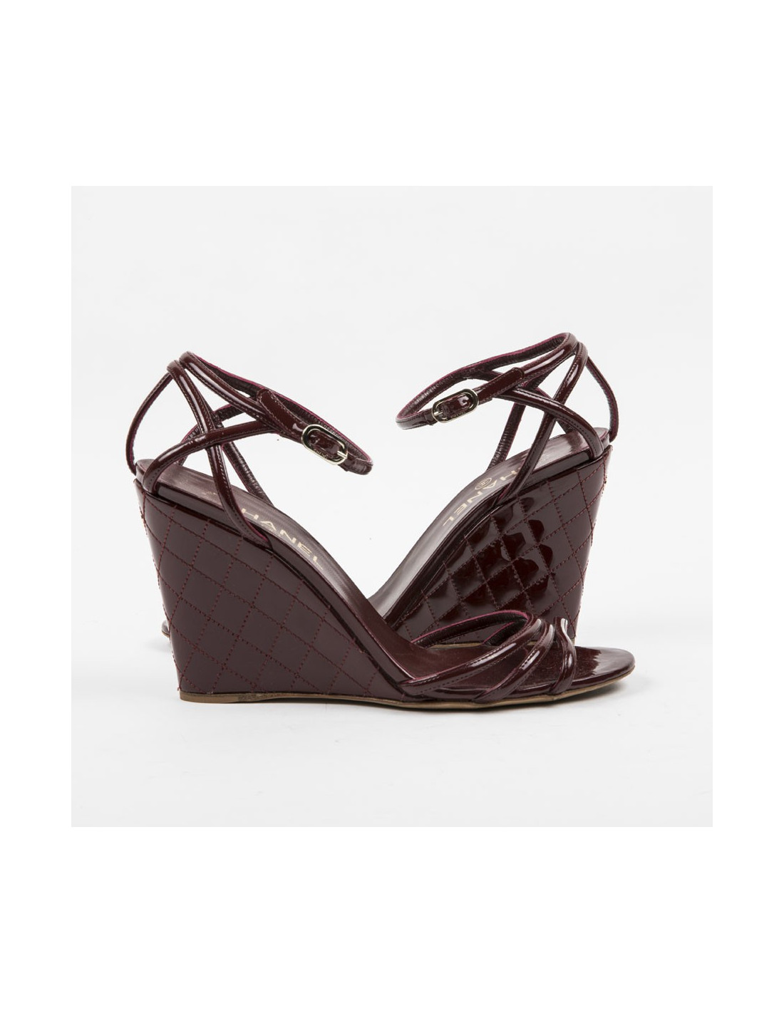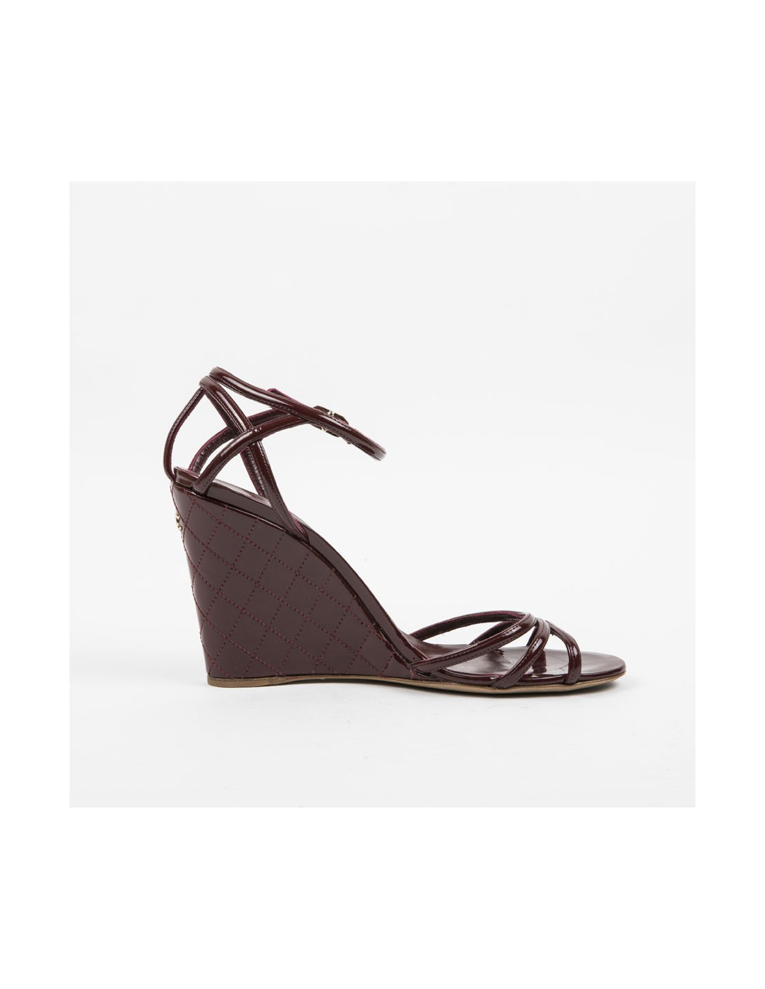 Sandales compensées Chanel en cuir verni matelassé bordeaux. Sigle "CC" en métal or à l'arrière de la chaussure. Semelles extérieures et intérieures en cuir véritable. Made in Italy.
