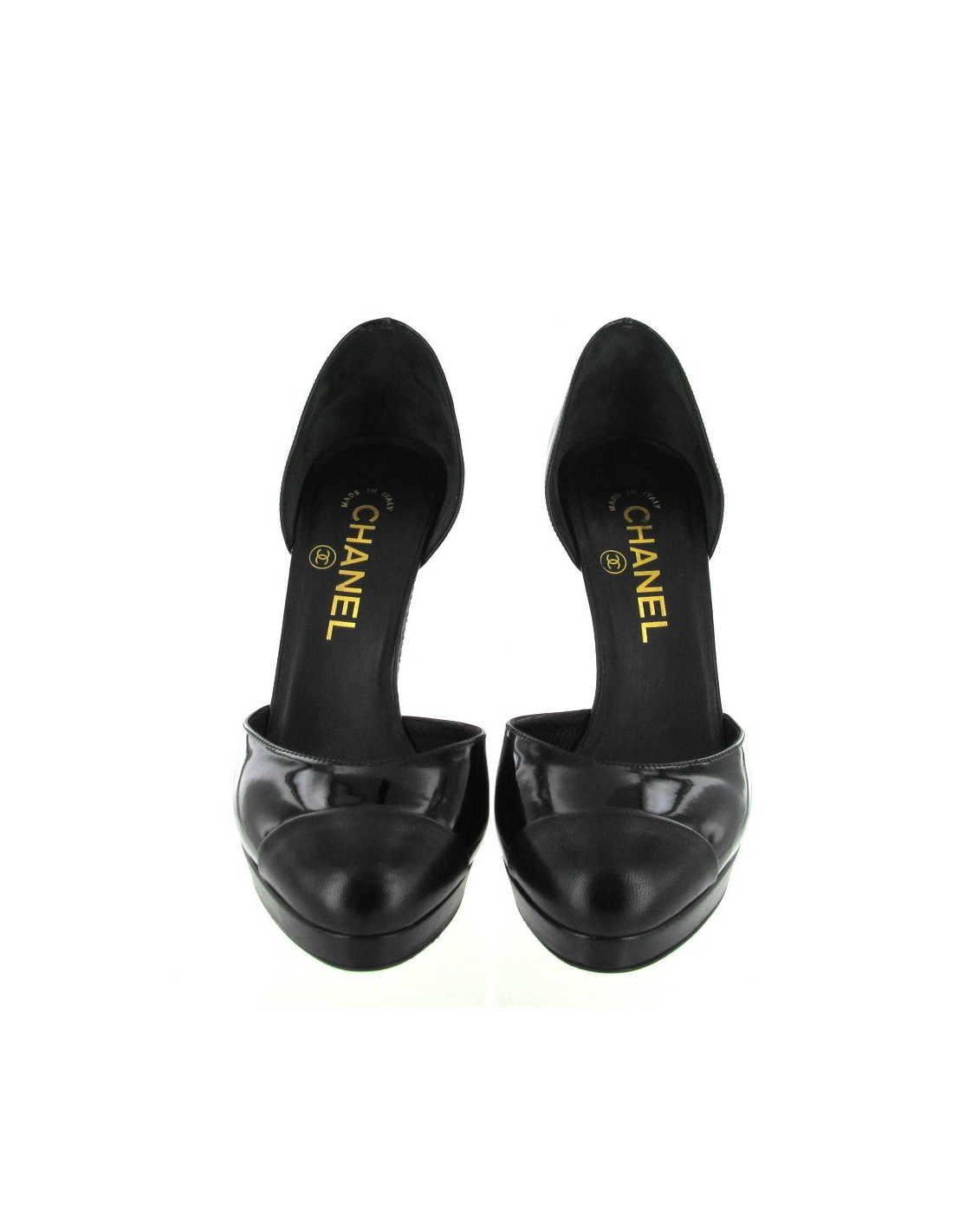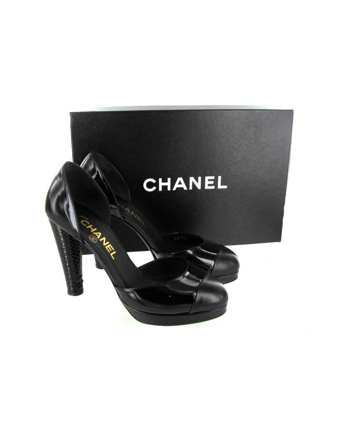 Superbes escarpins CHANEL, 37,5 en cuir vernis noir, avec une particularité, le bout est en cuir noir mat. Il y a une plateforme à l'avant en cuir noir. Le talon est en cuir vernis martelé en forme "d'écailles". Le sigle CC est présent sur le bas du talon.