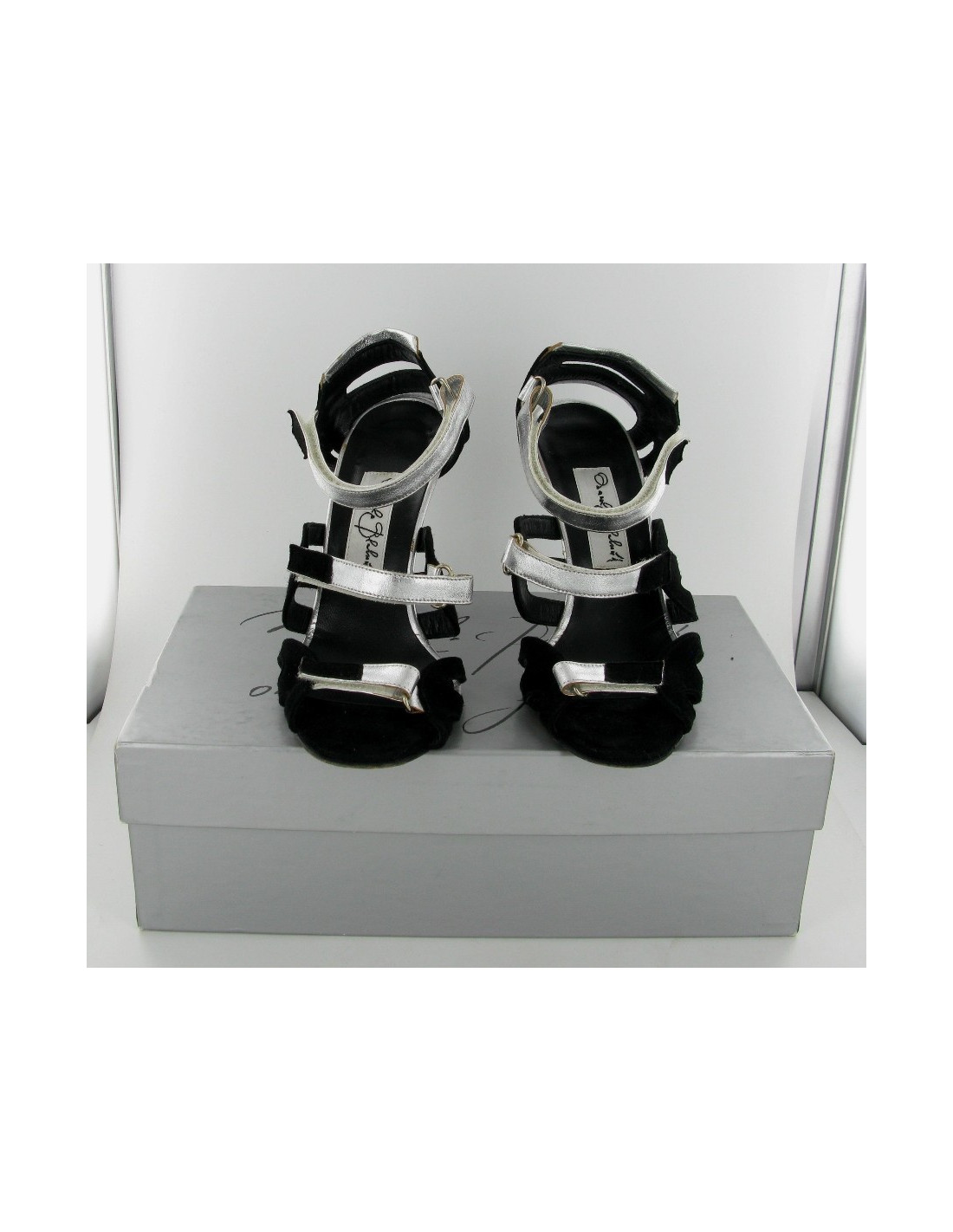 Superbes sandales Manolo Blahnik "brazilny" t35. 5 en daim noir et cuir argenté. 3 brides ajustables, fermeture par velcro. Longueur semelle intérieur: 23cm largeur extérieur: 10cm livrées dans leur boite d'origine, dustbag