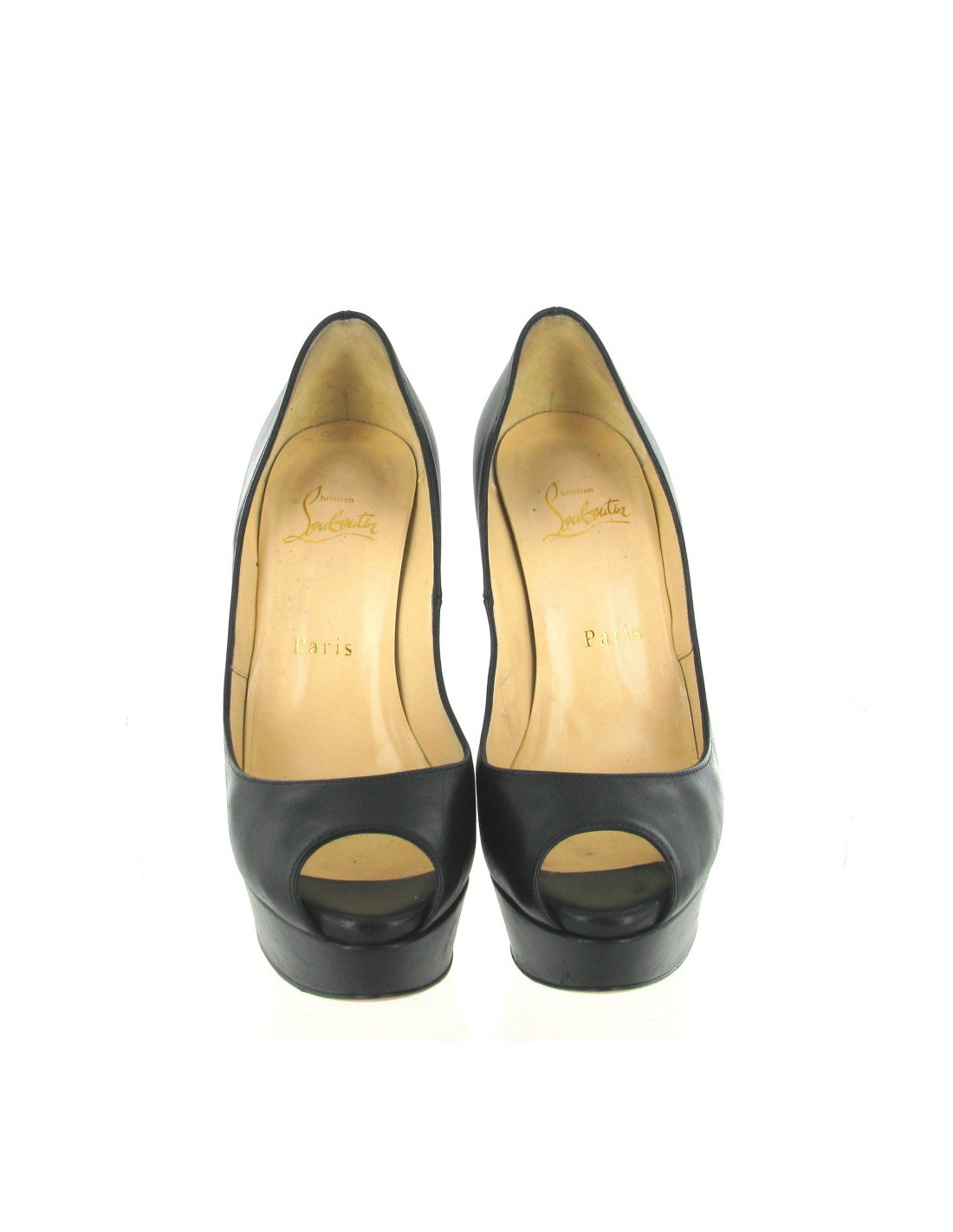Escarpins LOUBOUTIN T37 en cuir noir. La chaussure possède une plateforme à l'avant du pied et il y a une ouverture sur le bout du pied.