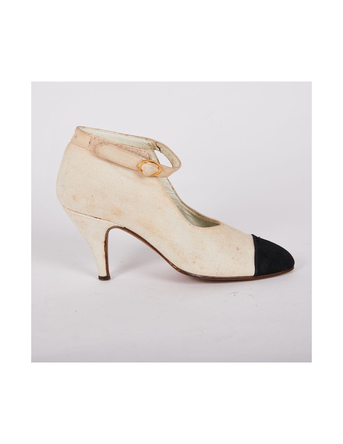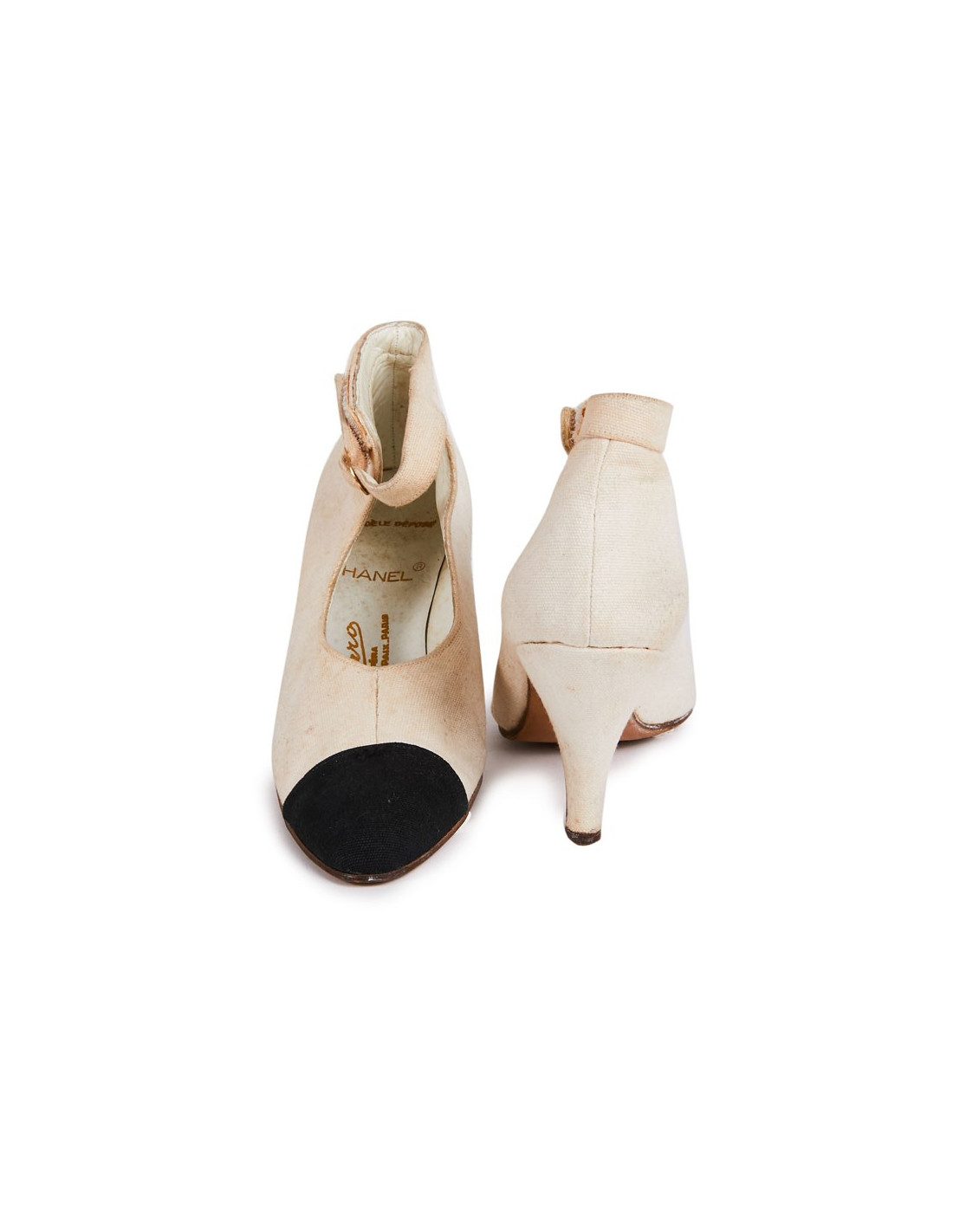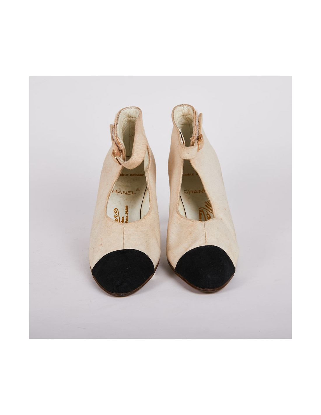 Escarpins montants Chanel en toile paille beige et noir. L'inscription est à l'intérieur de la chaussure "Modèle déposé Massaro Opéra, 2 rue de la Paix Paris ". Le bout de la chaussure est noir. Le talon est recouvert en toile paille. Les semelles intérieures et extérieures sont en cuir véritable. Fabriquées en Italie,