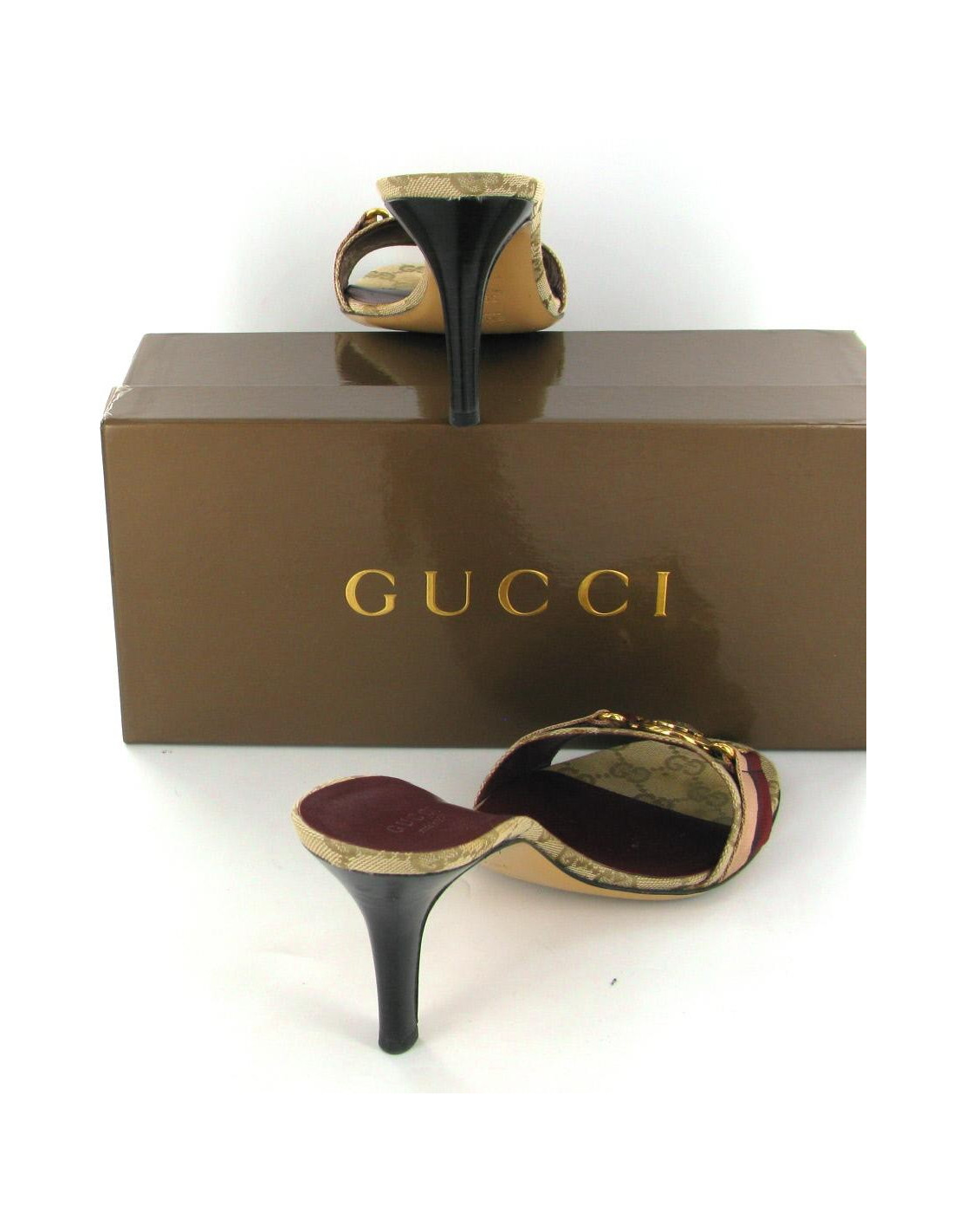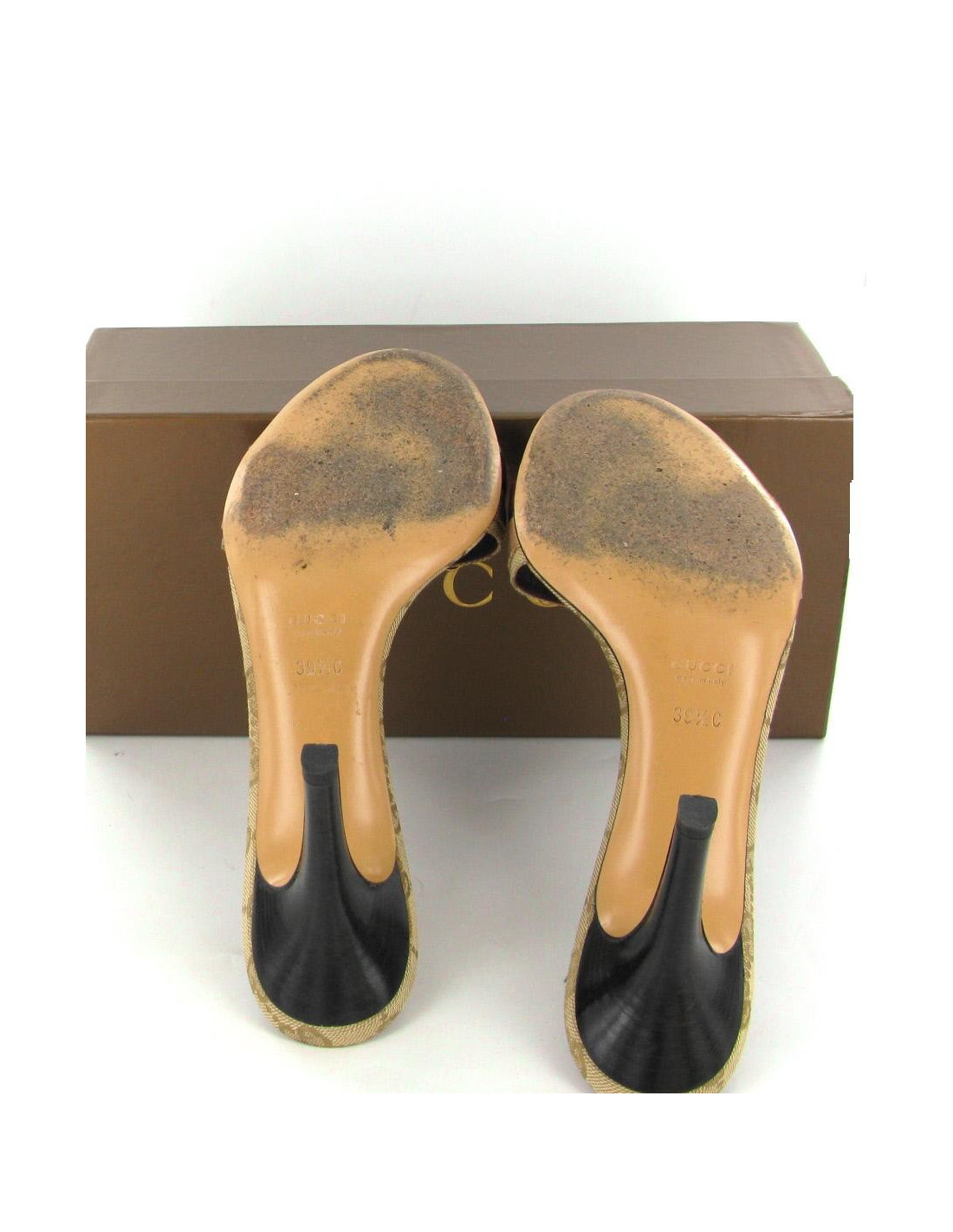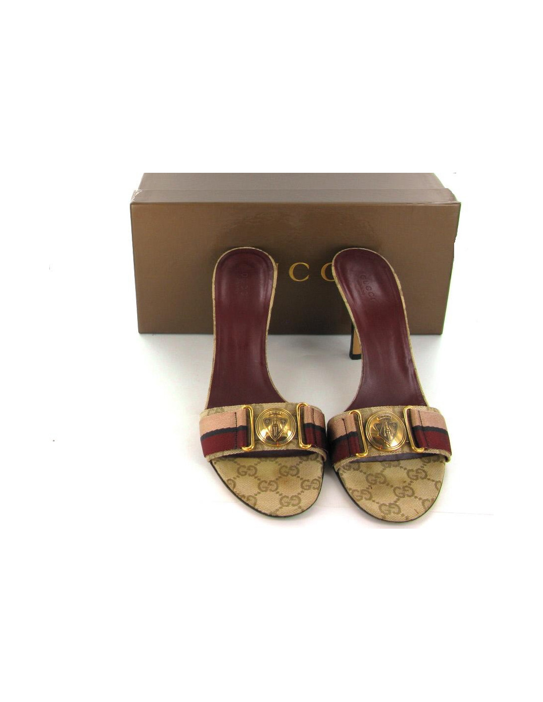 Mules GUCCI T39.5 en toile monogrammée GG beige et ébène avec une bordure en cuir bordeaux. Le motif est en métal or pâle mêlé avec tissu tricolore ( bordeaux, ébène et beige).La semelle intérieure et extérieure est en cuir. Elles sont en bon état et livrées avec leur boîte d'origine.