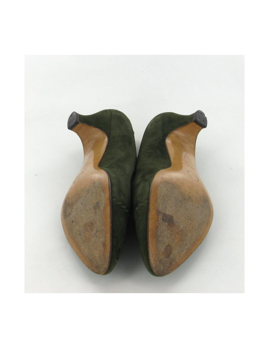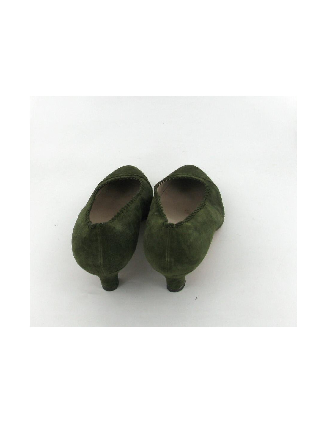Escarpins CHANEL T38 en daim vert cousus de fils de cuir. Ils sont très confortables grâce à leurs petits talons. Ils sont en très bon état (très peu portés).