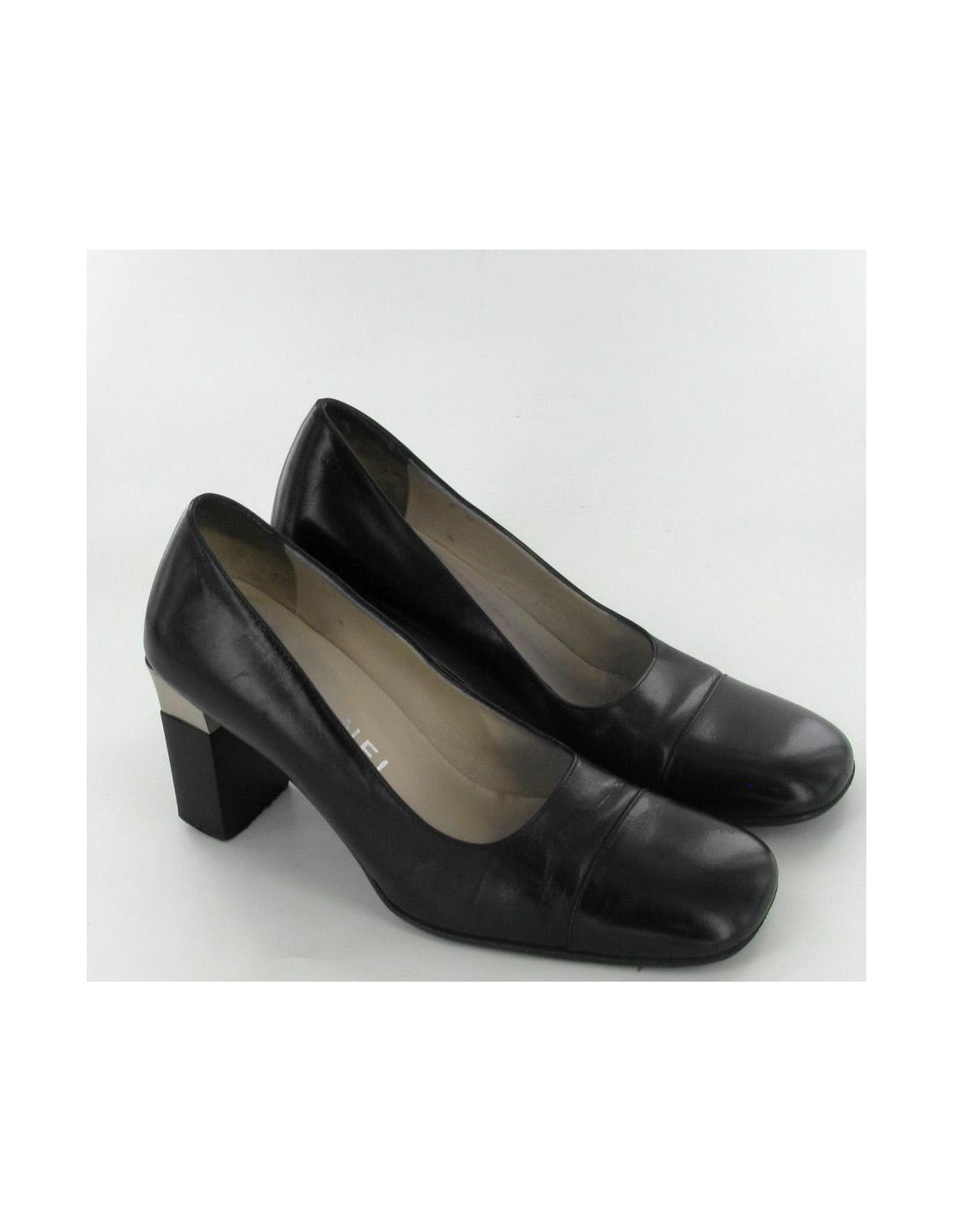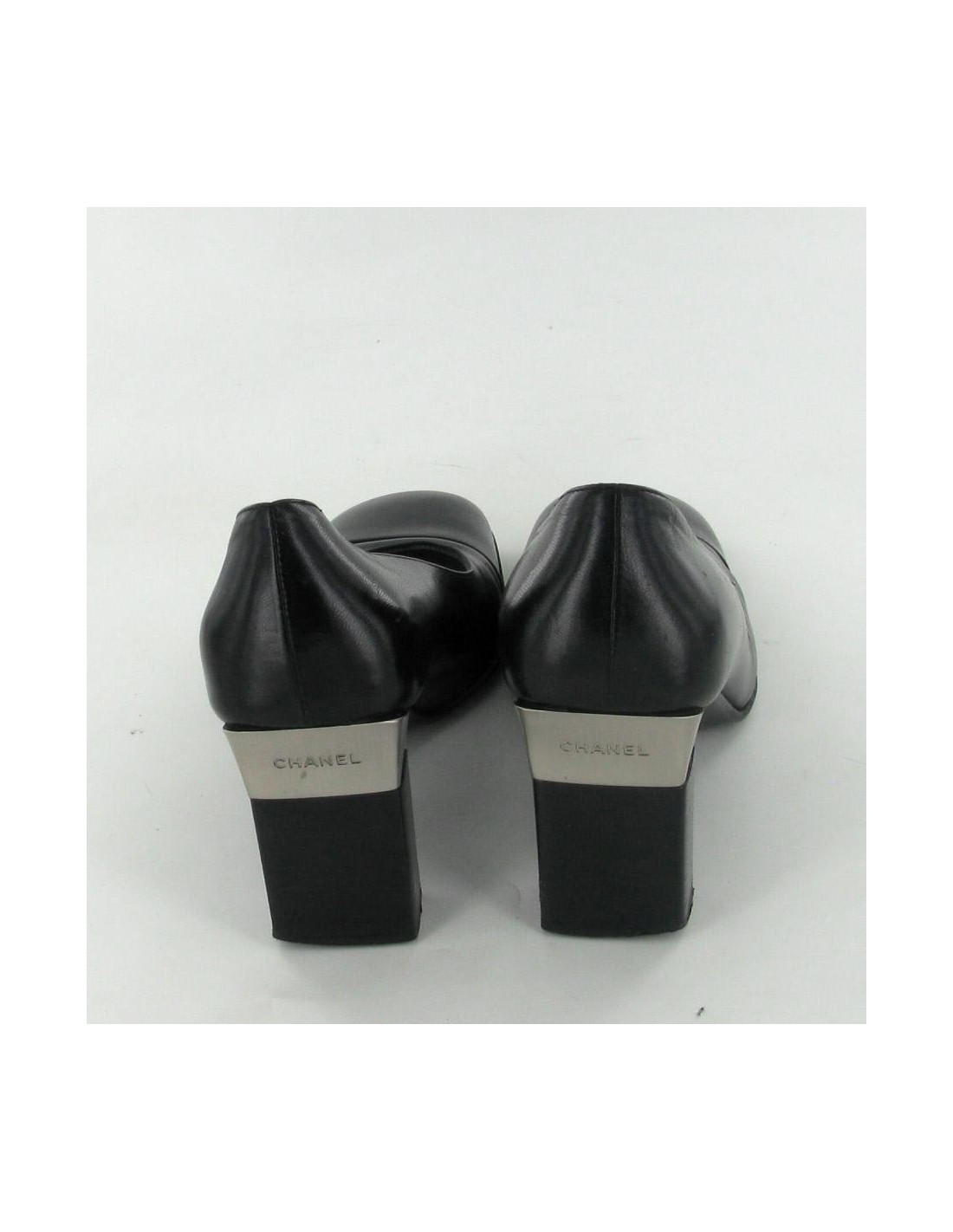 Escarpins CHANEL T 35 en cuir noir. Sur le talon, une plaque en métal argenté palladié brossé est ornée de l'inscription "CHANEL" . Ils sont confortables grâce à la stabilité donnée par la forme de la chaussure et le talon. Bon état.