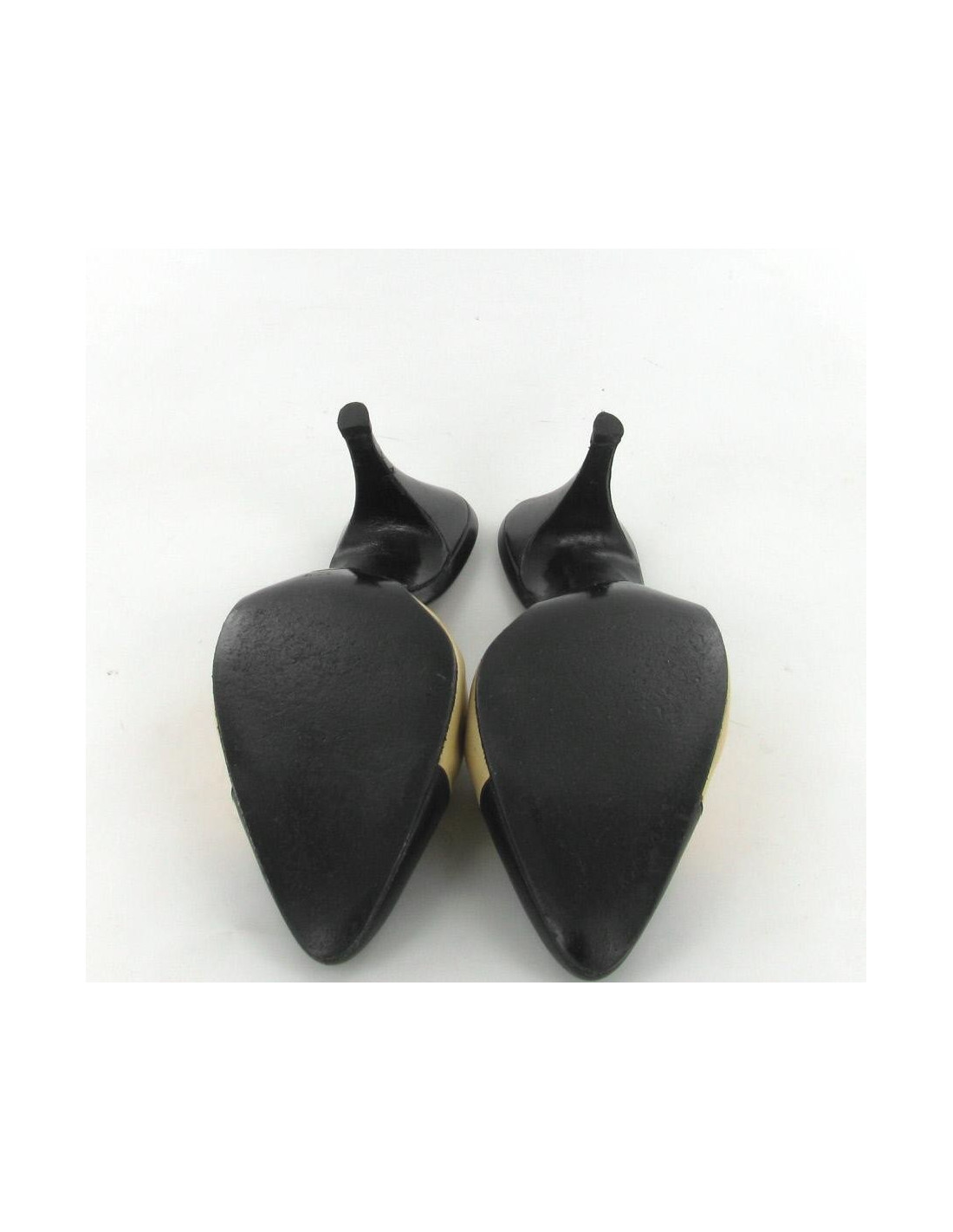 Mythiques Mules CHANEL T 39.5 bicolores noir et beige. Les semelles intérieure et extérieure sont en cuir siglées "CHANEL". Elles sont en bon état malgré de petites tâches peu visibles sur le cuir.