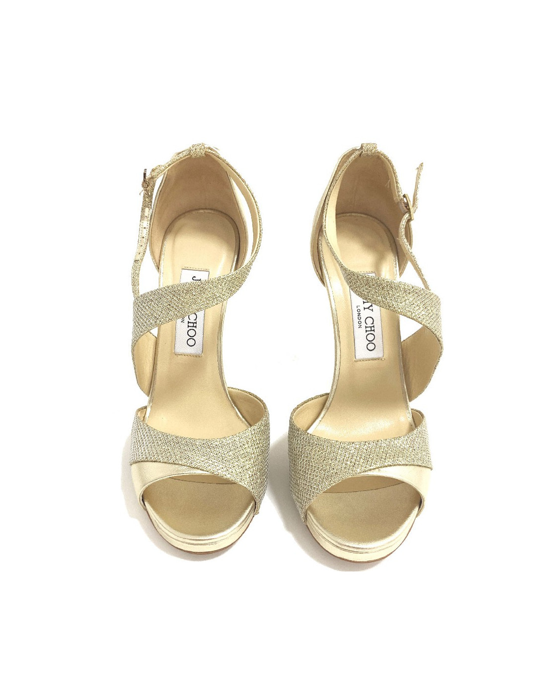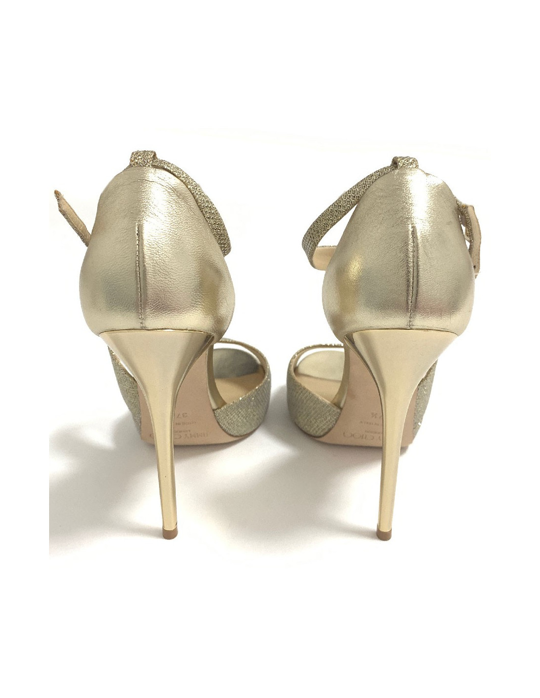 Superbe paire d'escarpins JIMMY CHOO en lamé doré et cuir nappa métallisé. Le pied est sublimé par de belles brides en cuir lamé texturé. Le talon doré brillant est légèrement compensé. Made in Italy.