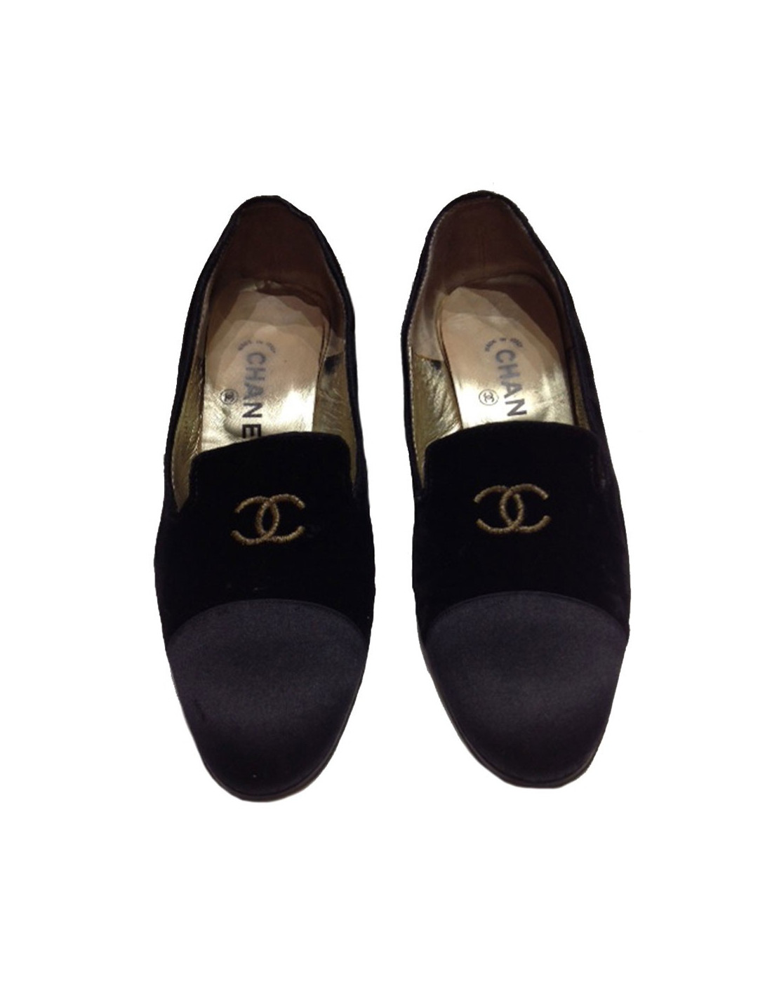 Superbes chaussures CHANEL "Richelieu" (type mocassins) en panne de velours et satin noir T 9 US - 40 FR.