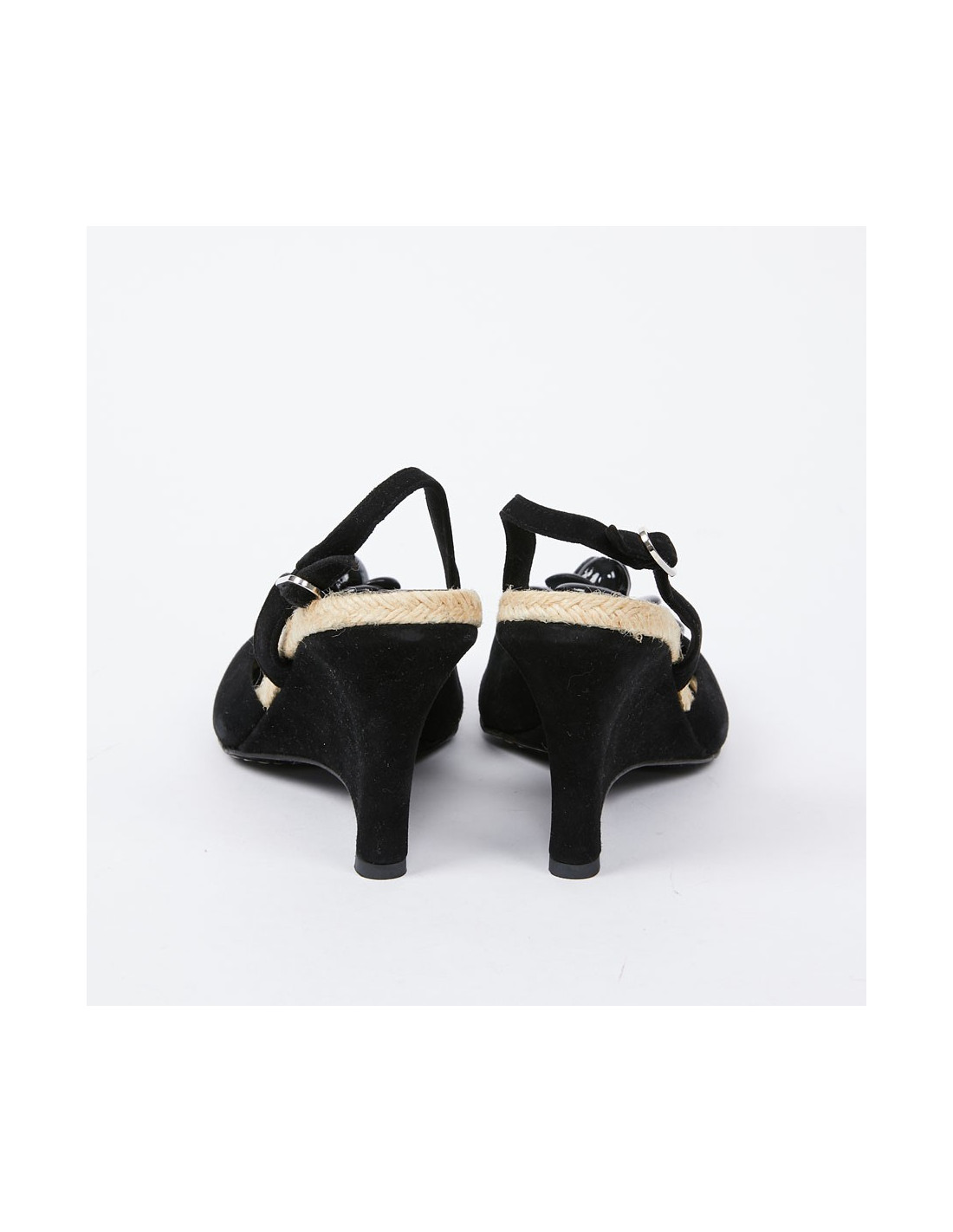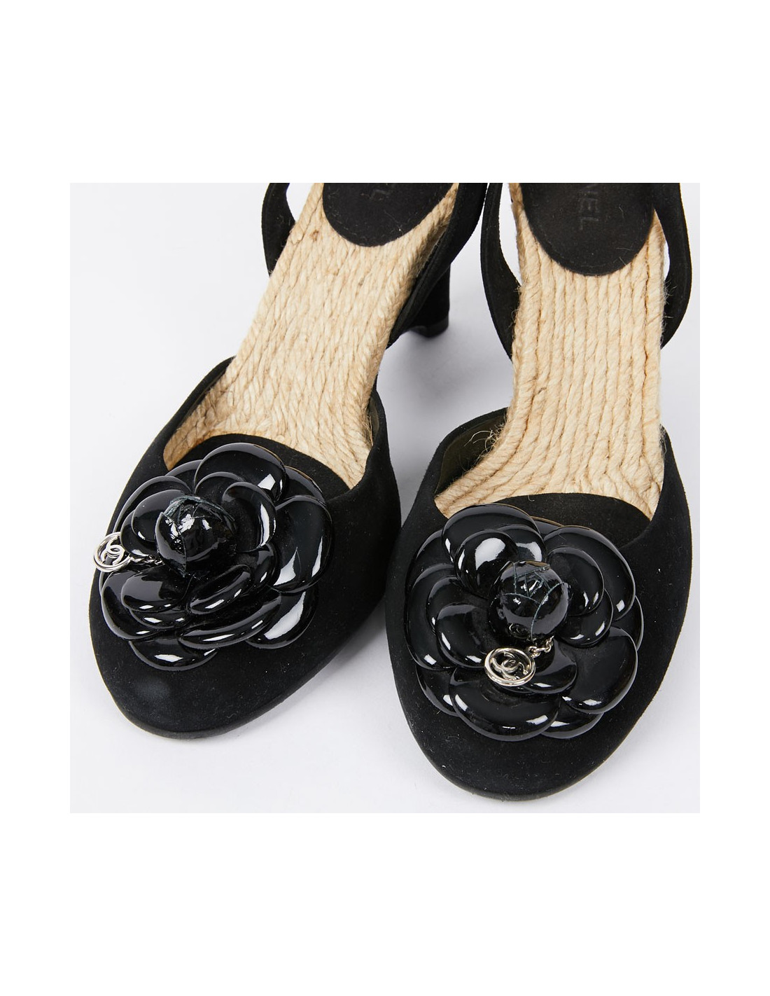 Ces sandales d'été CHANEL sont en veau velours et semelles en cordes. Elles sont agrémentées d'un camélia verni noir et d'un petit charm "CC" sur une mini chaîne argent, taille 39 Fr. Elles se ferment par une bride à l'arrière. Elles sont élégantes avec le choix de les porter avec un pantalon. ou une jupe.