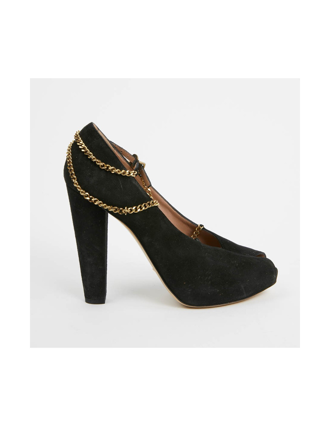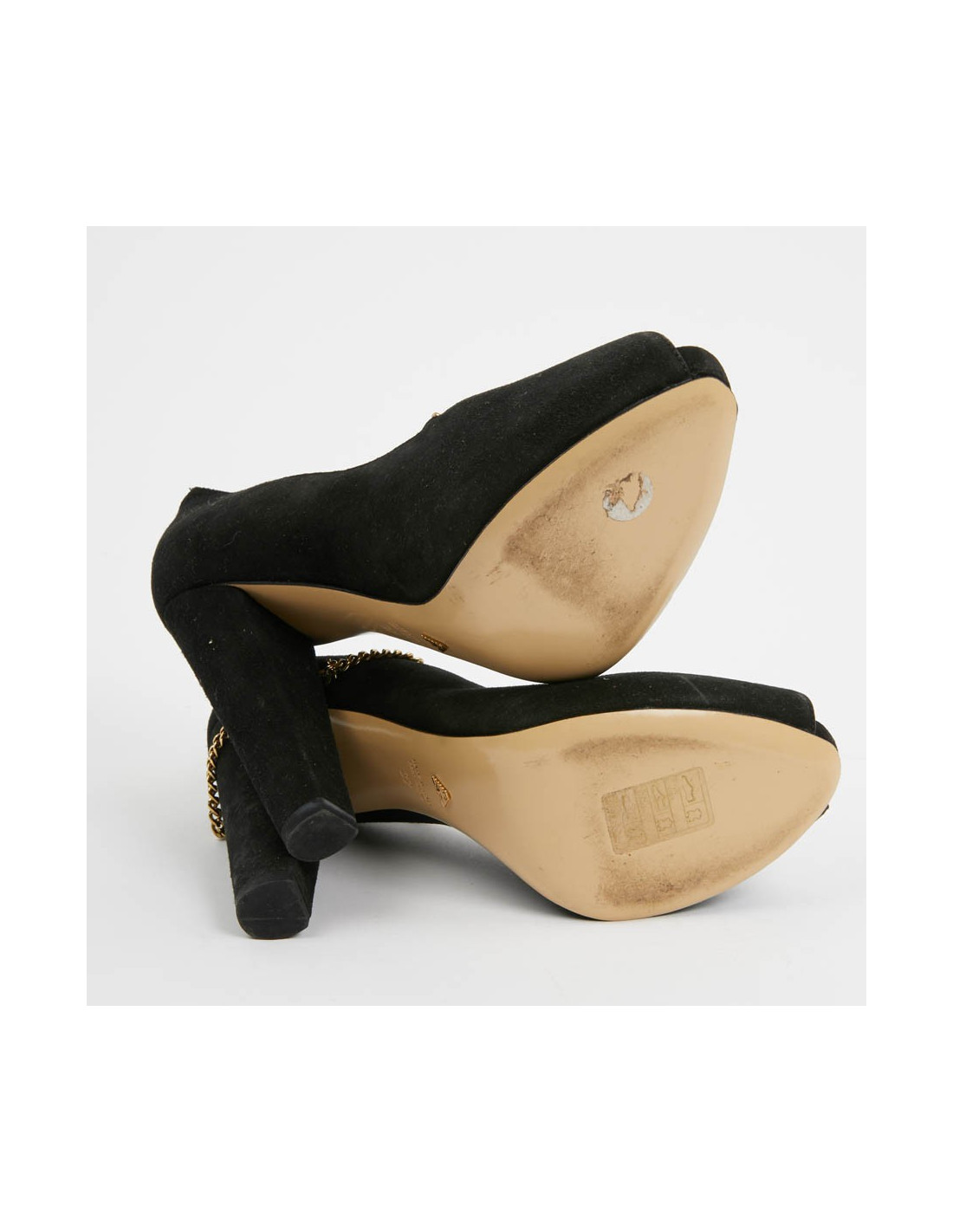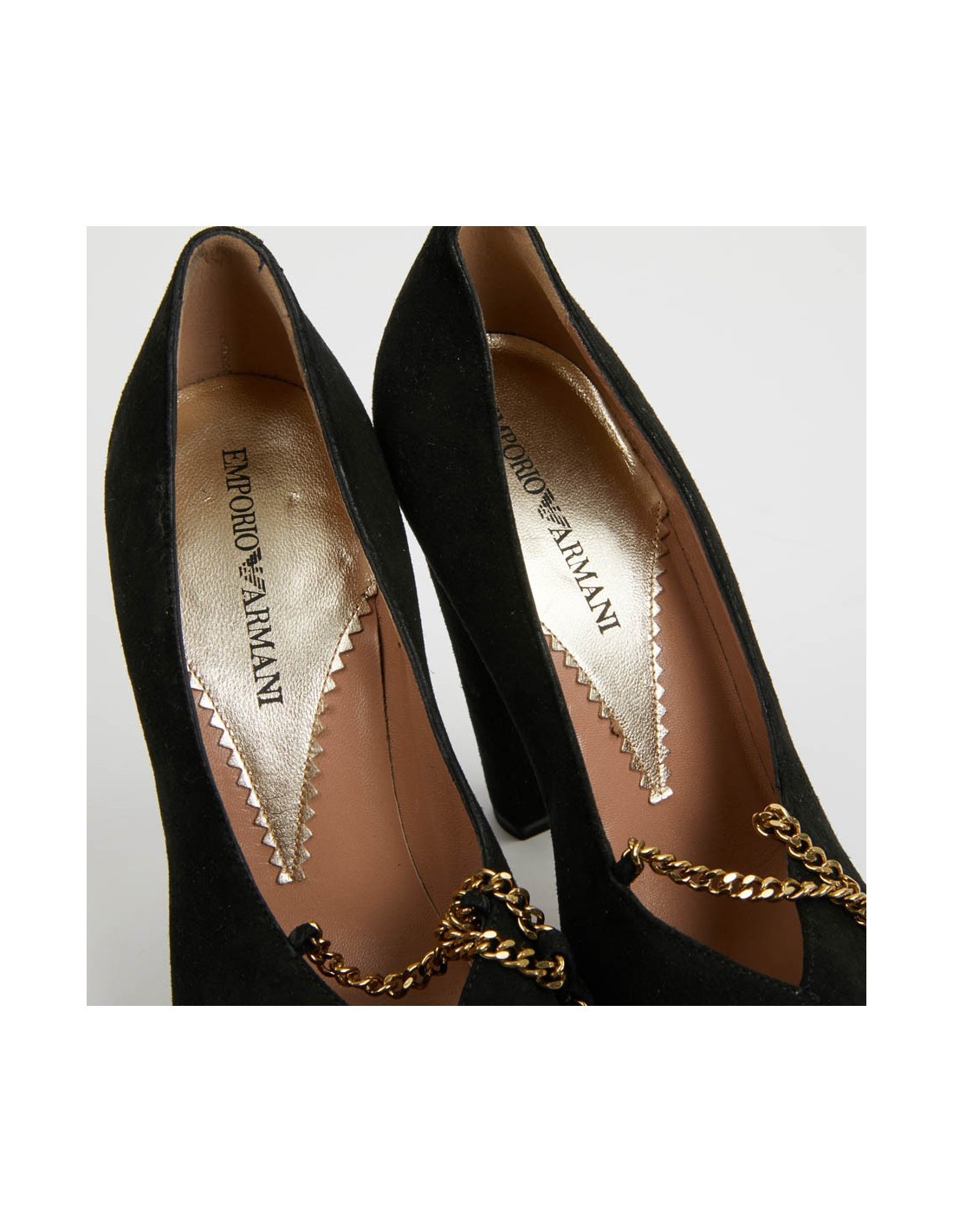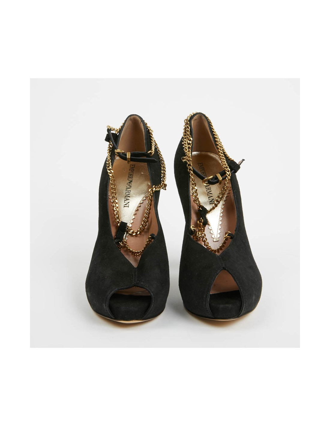 Escarpins Emporio ARMANI en suède noir. C'est une taille 37 fr. La chaine dorée s'attache autour de la cheville. Elles sont doublées en cuir. Elles n'ont jamais été portées, les traces visibles sur les semelles sont dues aux essayages.