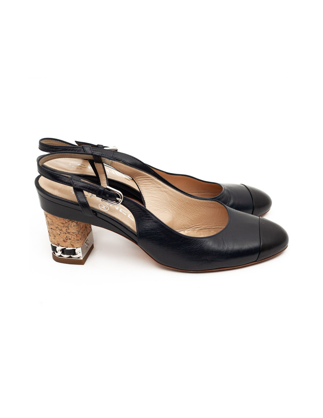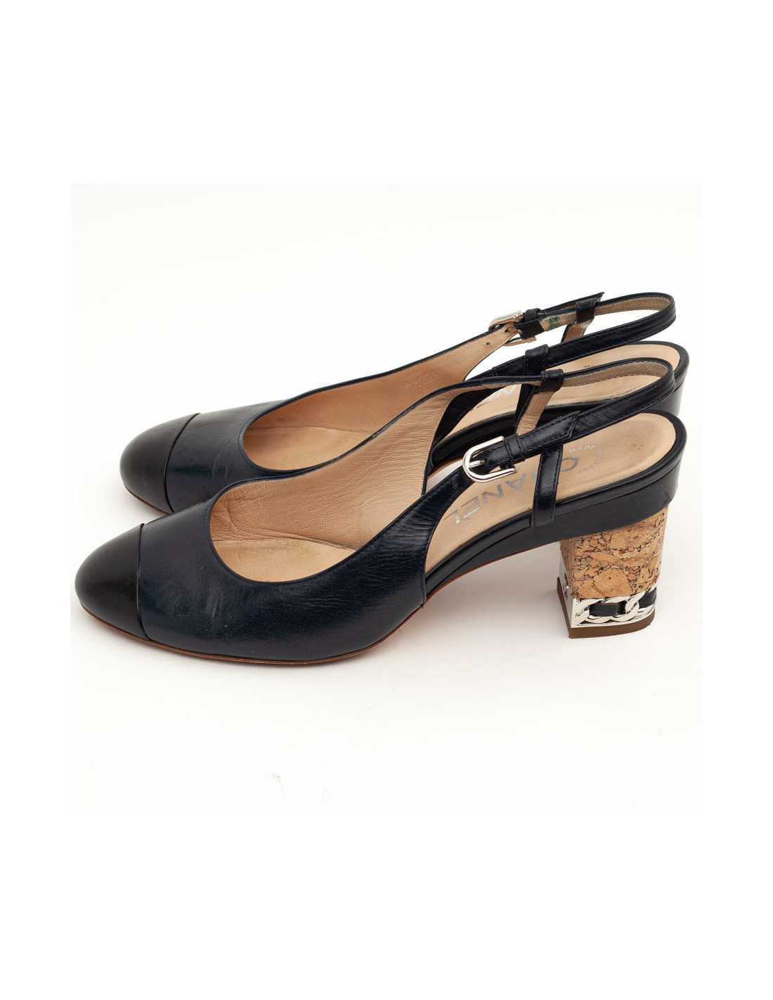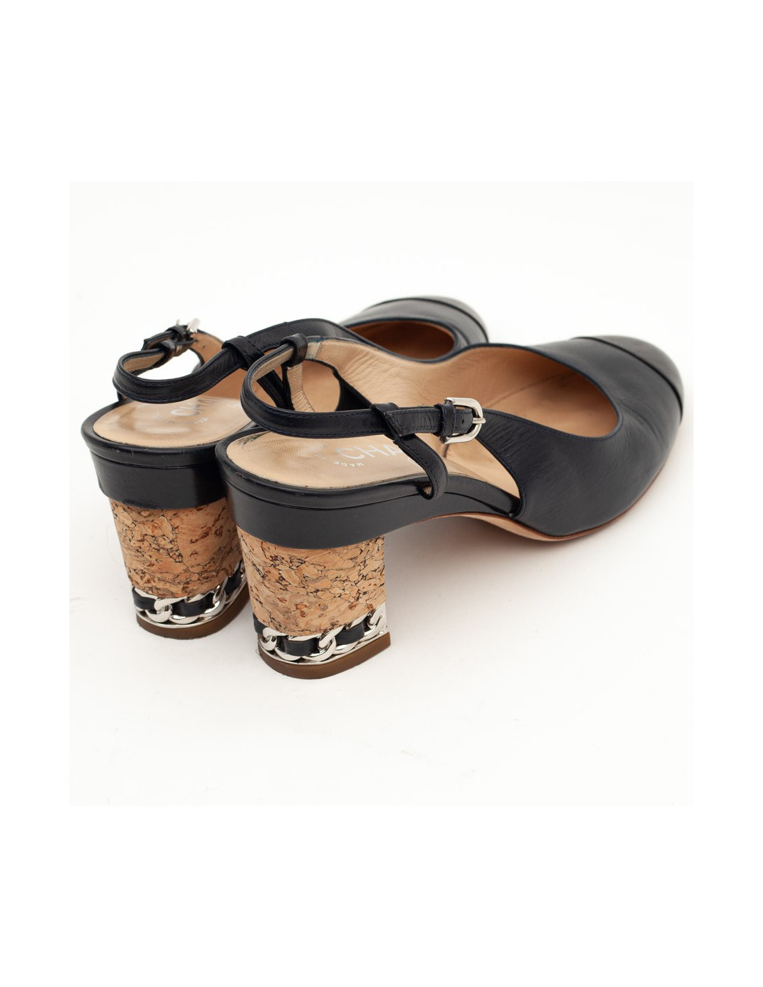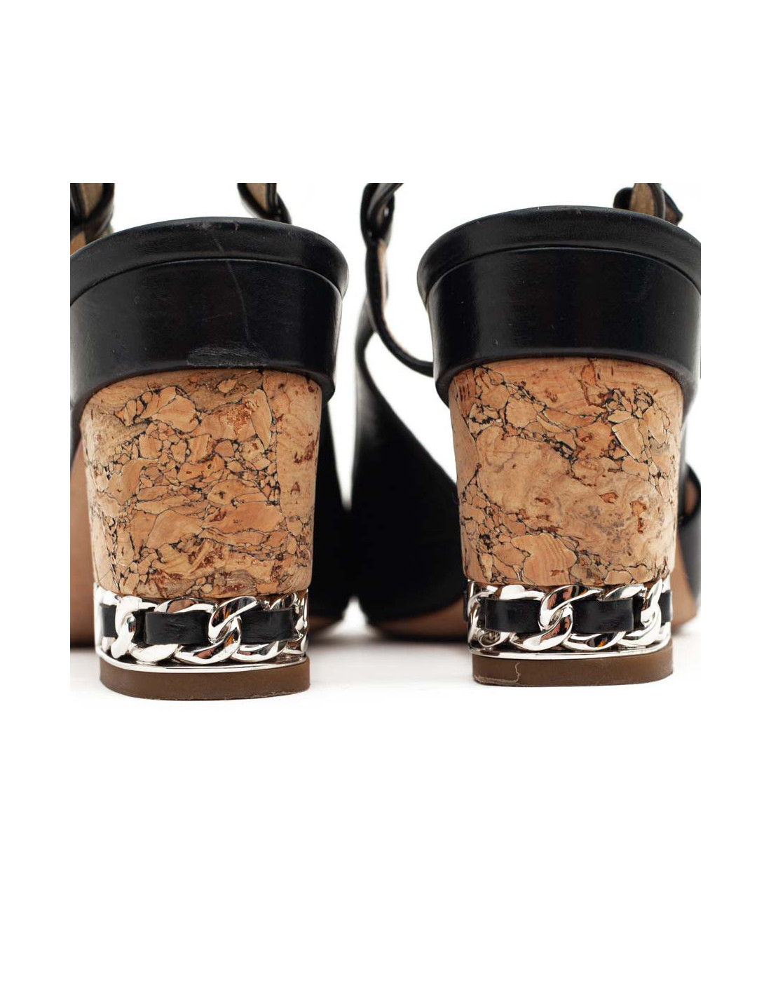 Jolie paire de sandales à talons Chanel en cuir bicolores. Le talon est en liège et il est orné de la chaîne iconique de la Maison argent entrelacé de cuir noir.