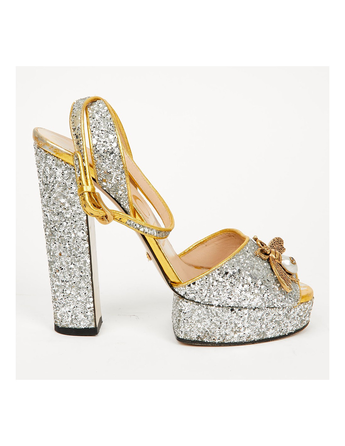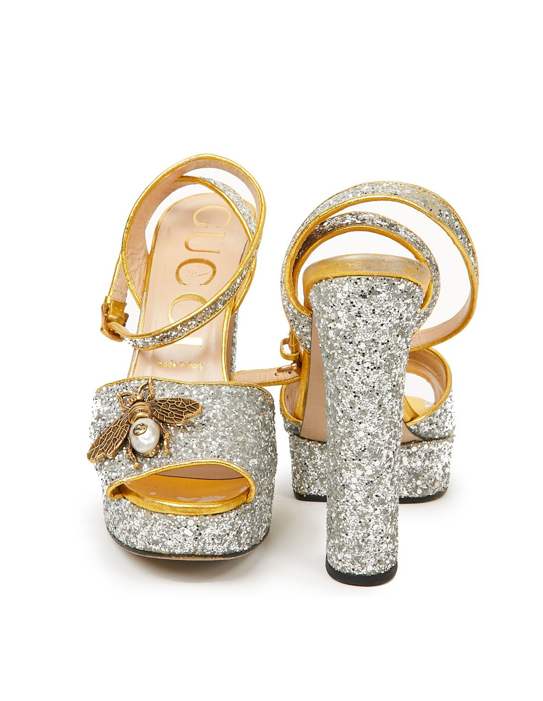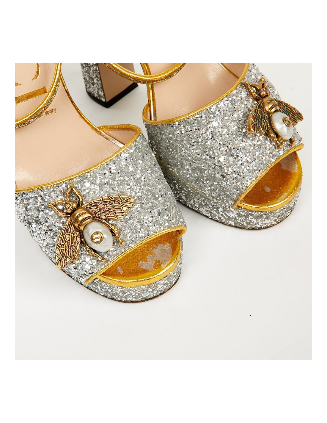 Spectaculaires. Sandales agrémentées d'abeilles or vintage et nacre à l'avant de la chaussure, argentées de la Maison Gucci Soko avec finitions en cuir doré.