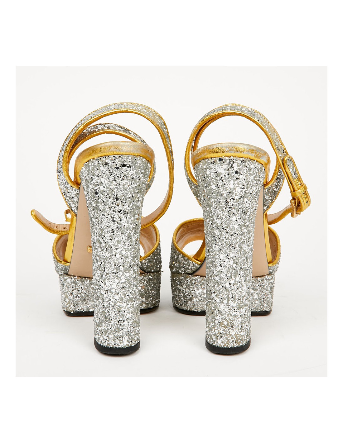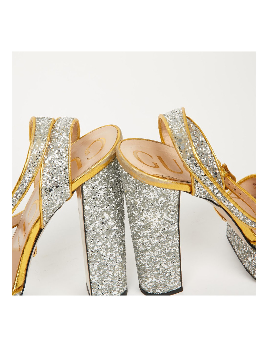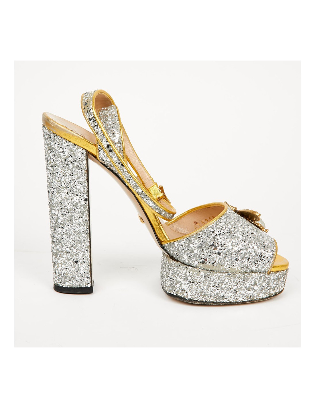 Spectaculaires. Sandales agrémentées d'abeilles or vintage et nacre à l'avant de la chaussure, argentées de la Maison Gucci Soko avec finitions en cuir doré.