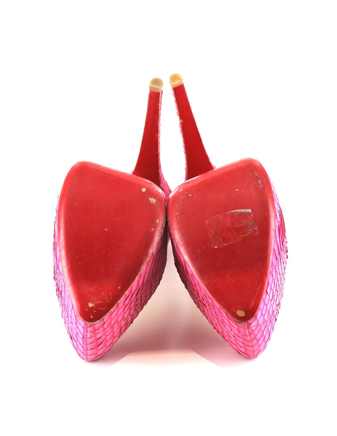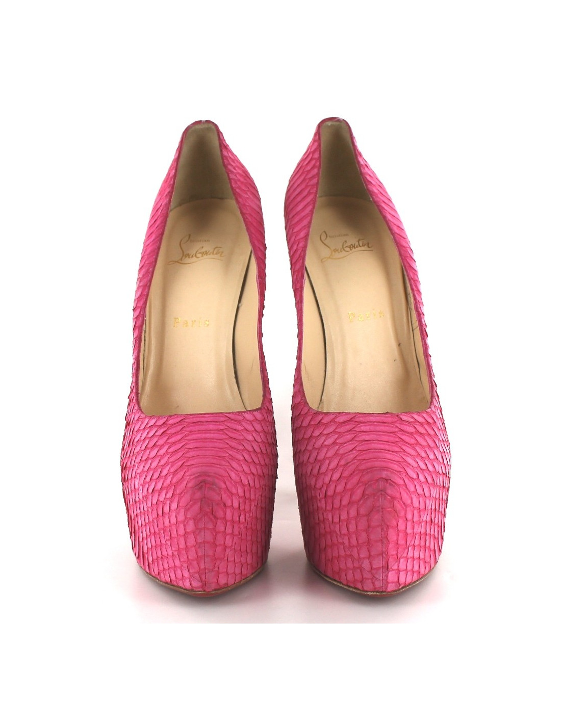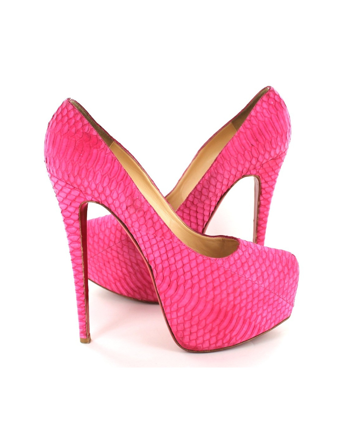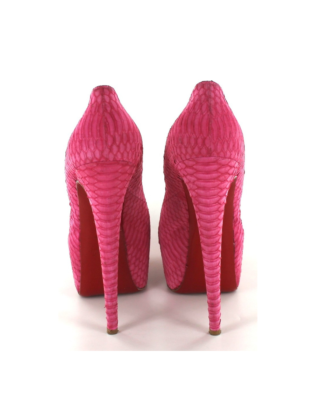 Escarpins T40 Christian Louboutin en python rose avec haute platerforme. Semelles intérieures et extérieures en cuir. Très peu portées,. Python en très bon état. Ce modèle vertigineux est une pièce exceptionnelle. Made in Italy.