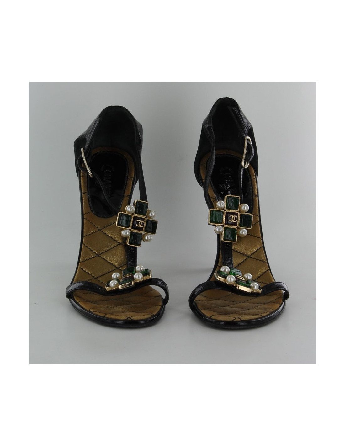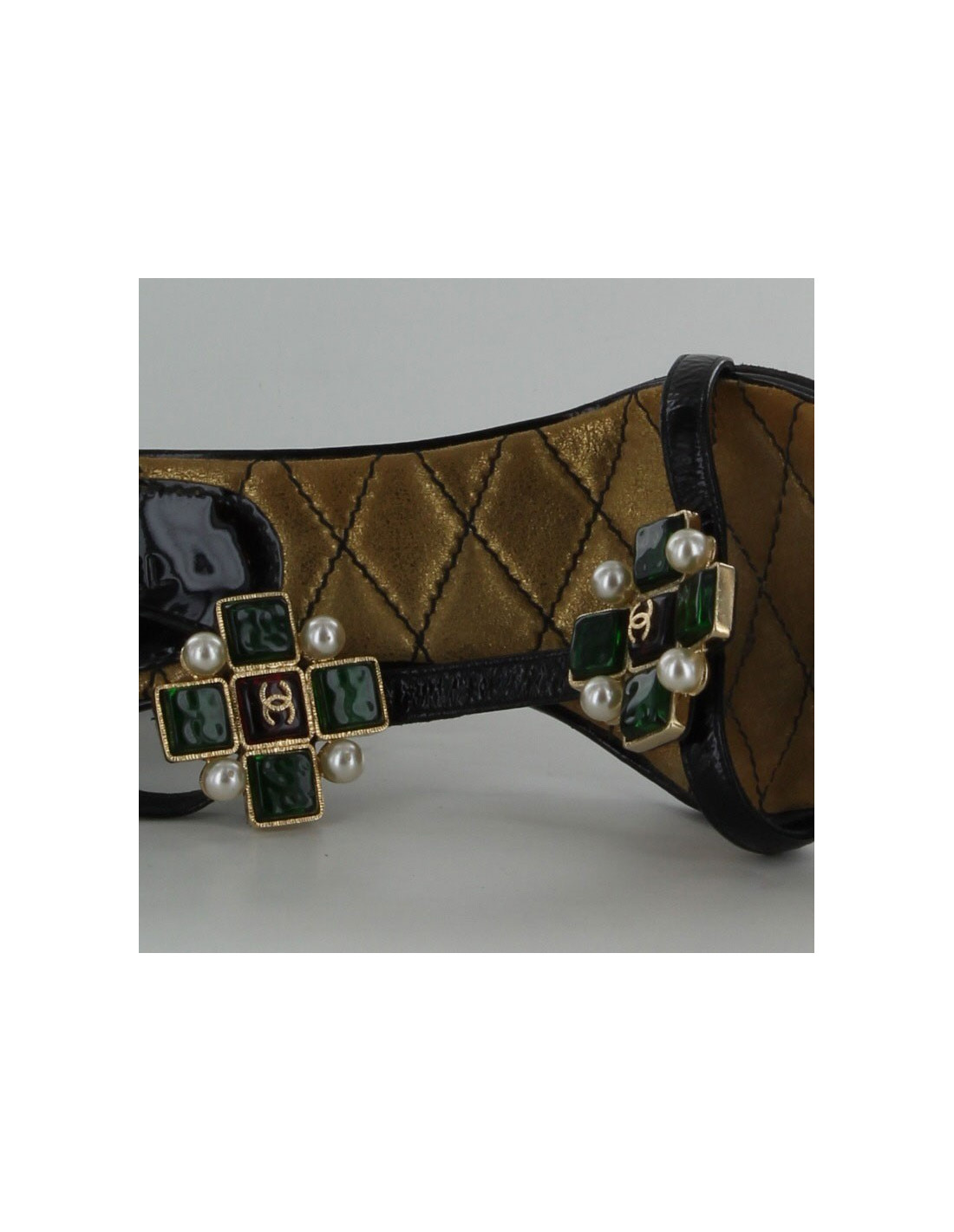 Superbes escarpins couture Chanel, taille 38.5, surmontés de 2 bijoux croix émeraude et rubis en pâte de verre et perles nacrées. ils sont en cuir verni noir . Ayant été portés, il y a quelques traces d'usure sur les talons, mais dans l'ensemble elles sont en très bon état.