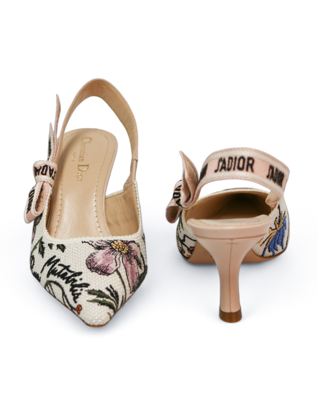 Détails : imprimé fleuri, inscription "Rose Mutabilis" sur l'avant de la chaussure et "J'adior" sur la sangle élastique