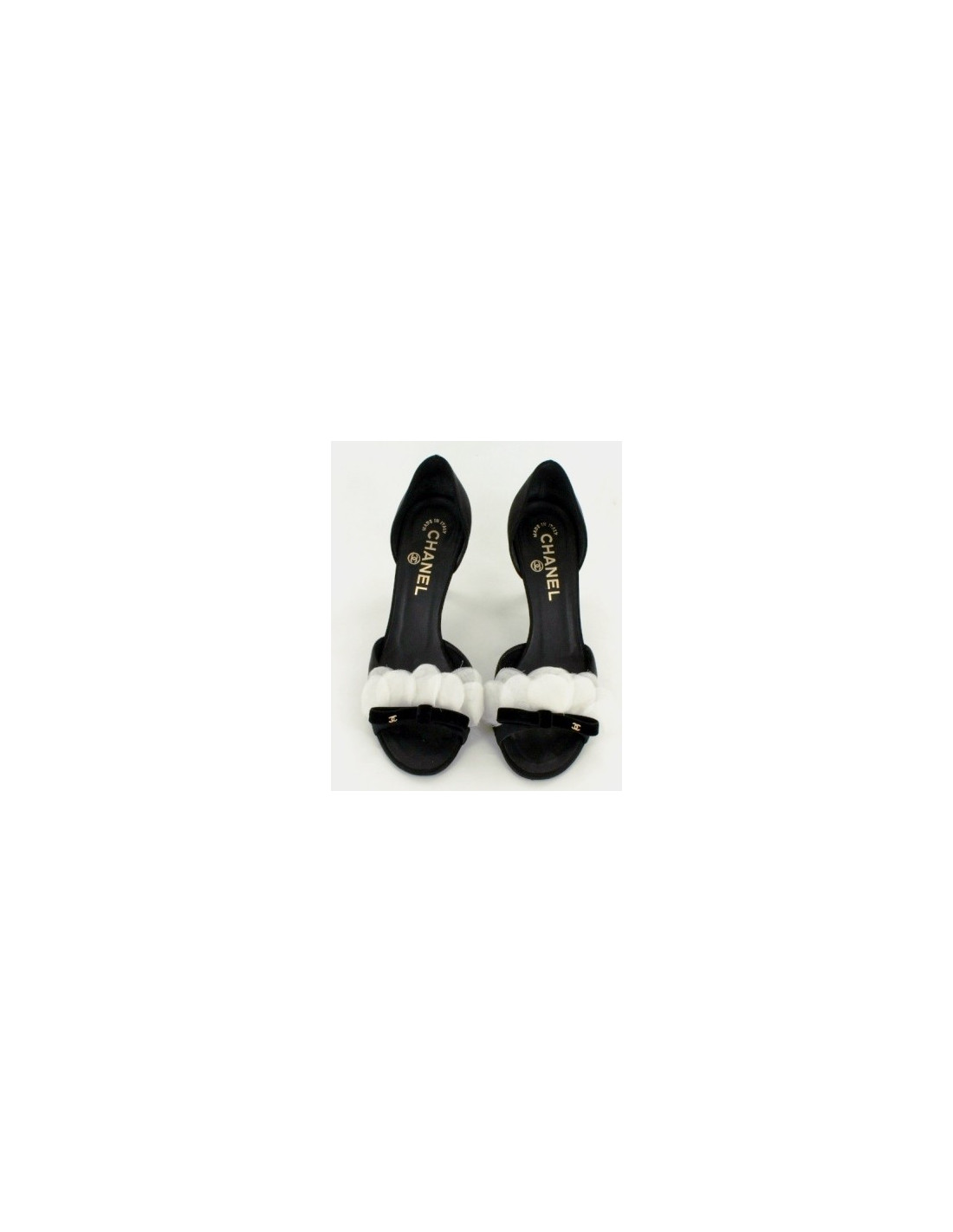 Ravissantes sandales Chanel, taille 36.5 en satin de soie noir et camelia blanc de soie et ruban de velours noir et double C doré. l'intérieur est en cuir noir. elles sont en excellent état. Très légère usure du talon droit.
