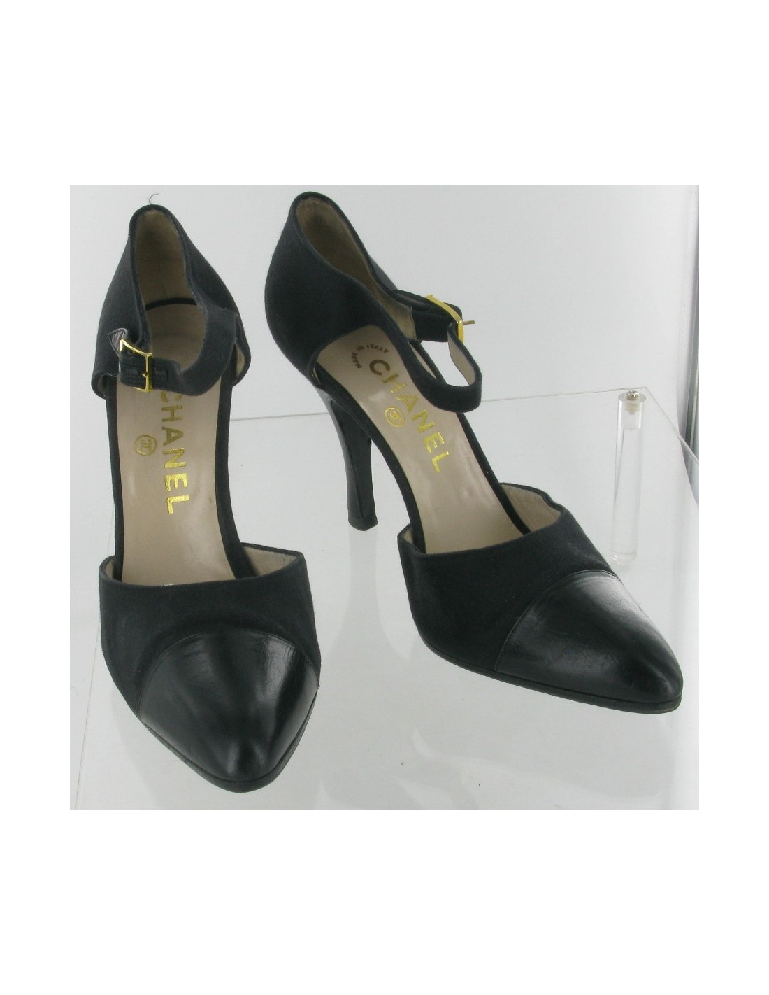 Magnifiques escarpins noir CHANEL en toile et cuir noir. Fermeture de la chaussure par une boucle à la cheville.