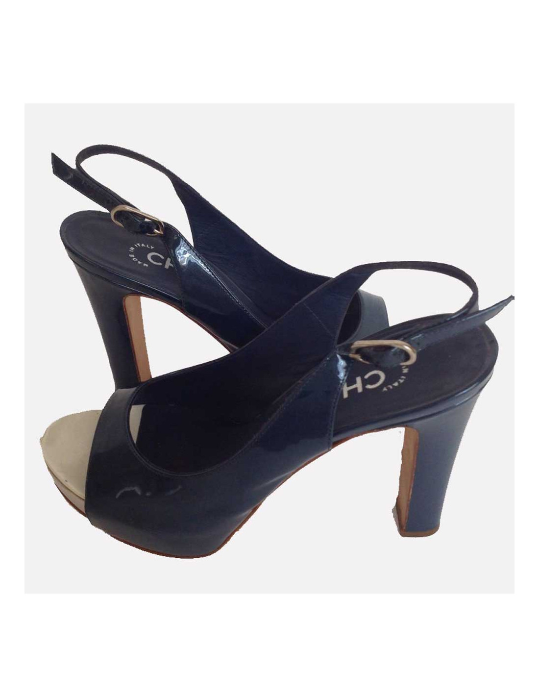Escarpins Chanel T 37 bleu canard en cuir verni avec une plateforme couleur argent avec le logo Chanel au devant de la chaussure . Trés bon état.