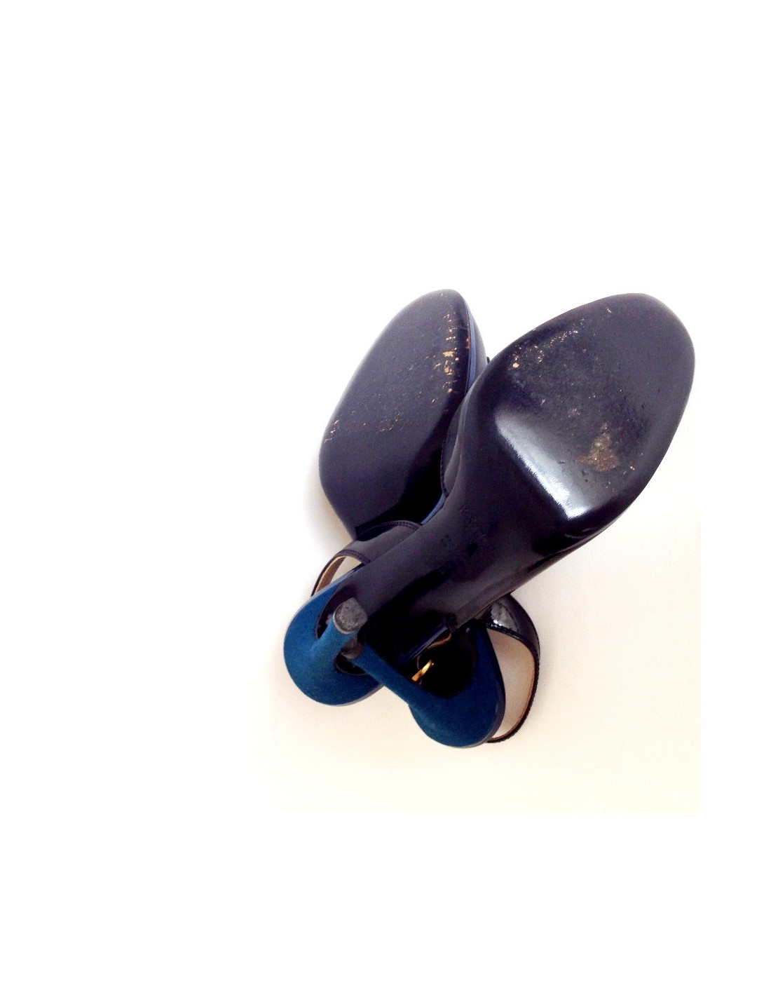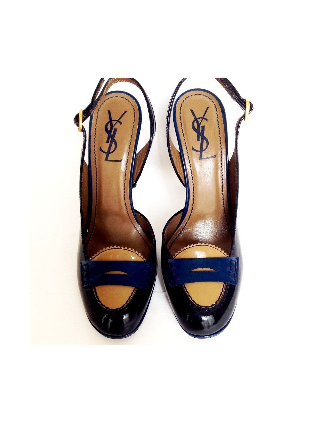 Escarpins YVES SAINT LAURENT T 38 tricolore bleu foncé et clair, et marron clair en cuir véritable.