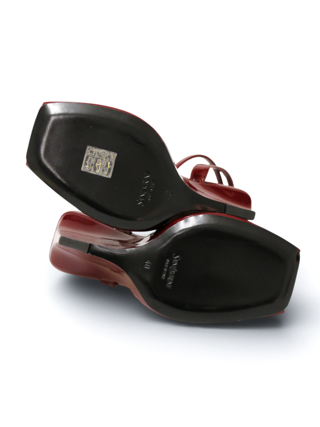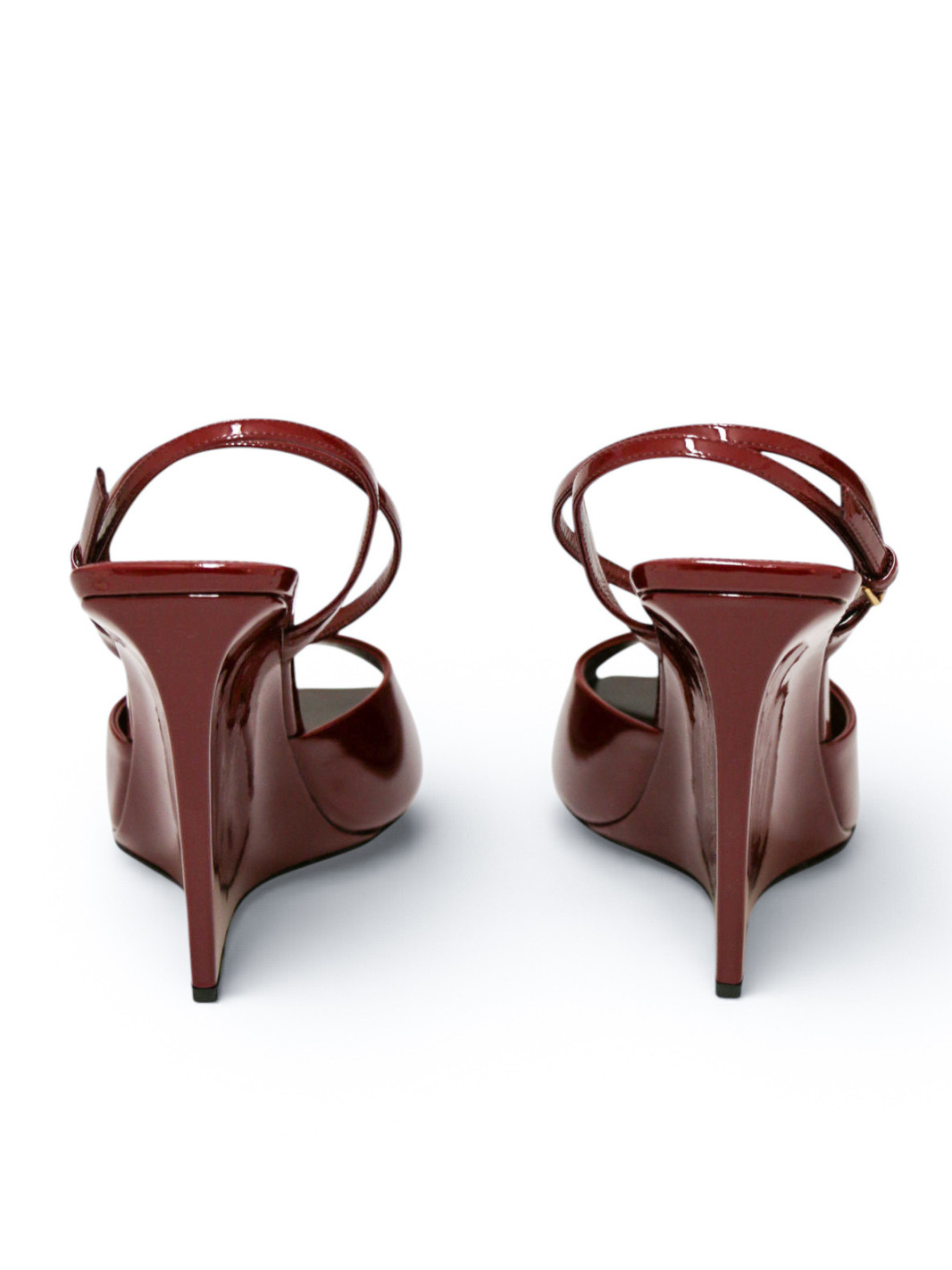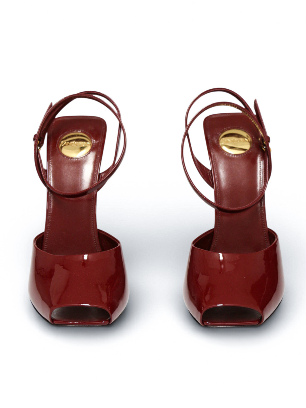Jamais porté. Ces escarpins sandales sont de couleur bordeaux avec une finition brillante. Elles ont un bout carré ouvert et une double fine bride autour de la cheville. Leur talon compensé de 12 cm offre plus de stabilité et confort. Elégantes et épurées, elles s'adaptent facilement à différents styles. Elles conviennent aussi bien pour le travail, la vie quotidienne que pour des occasions habillées.