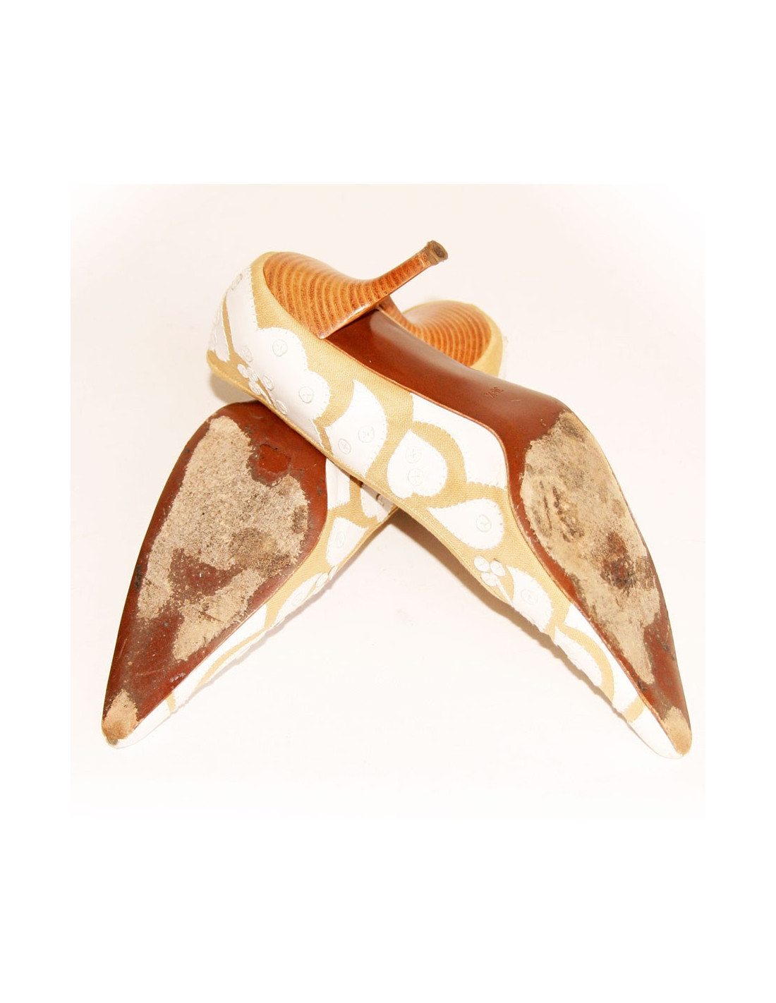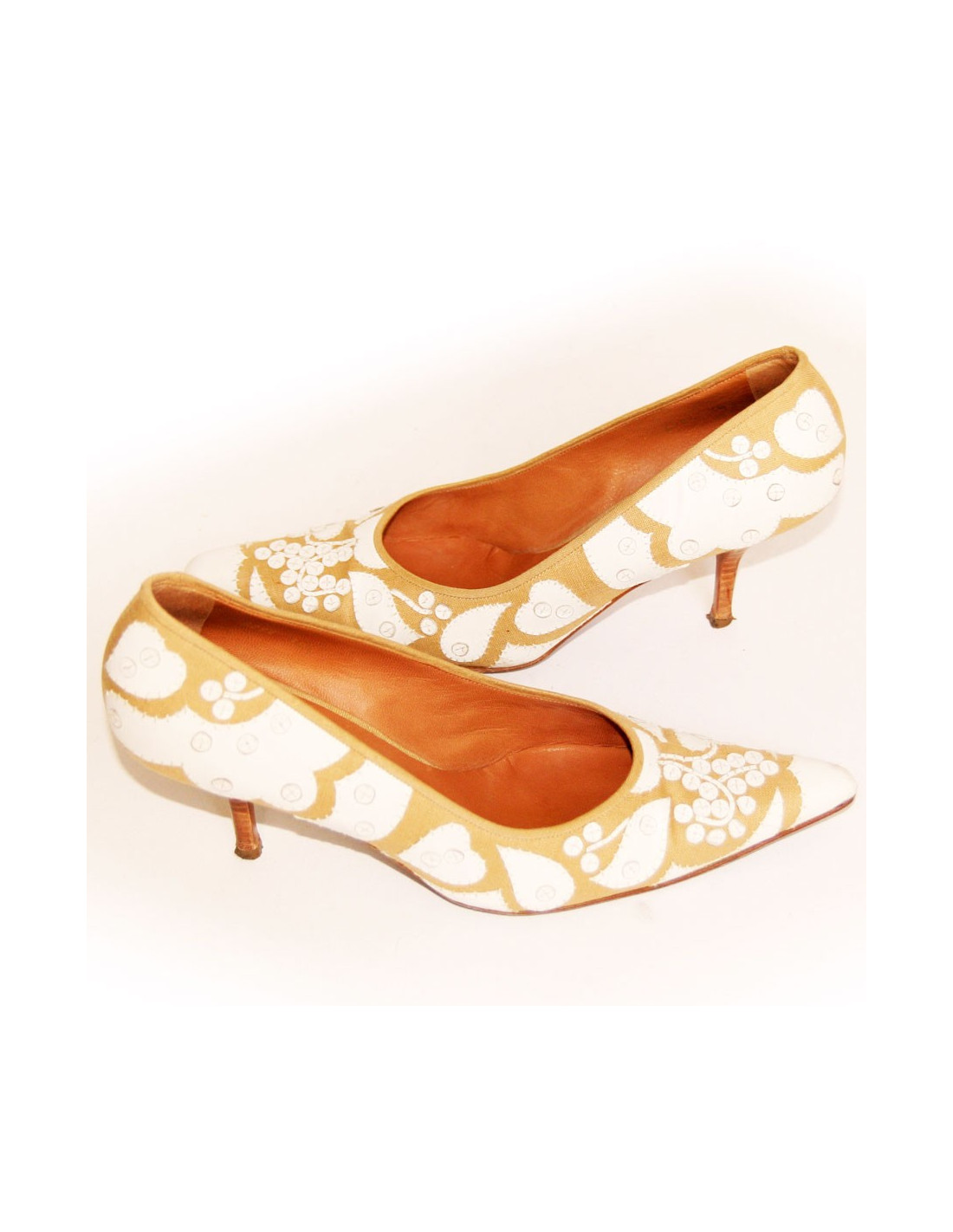 Escarpins en raphia marron et empiècements de cuir blanc Walter Steiger Taille 38,5
