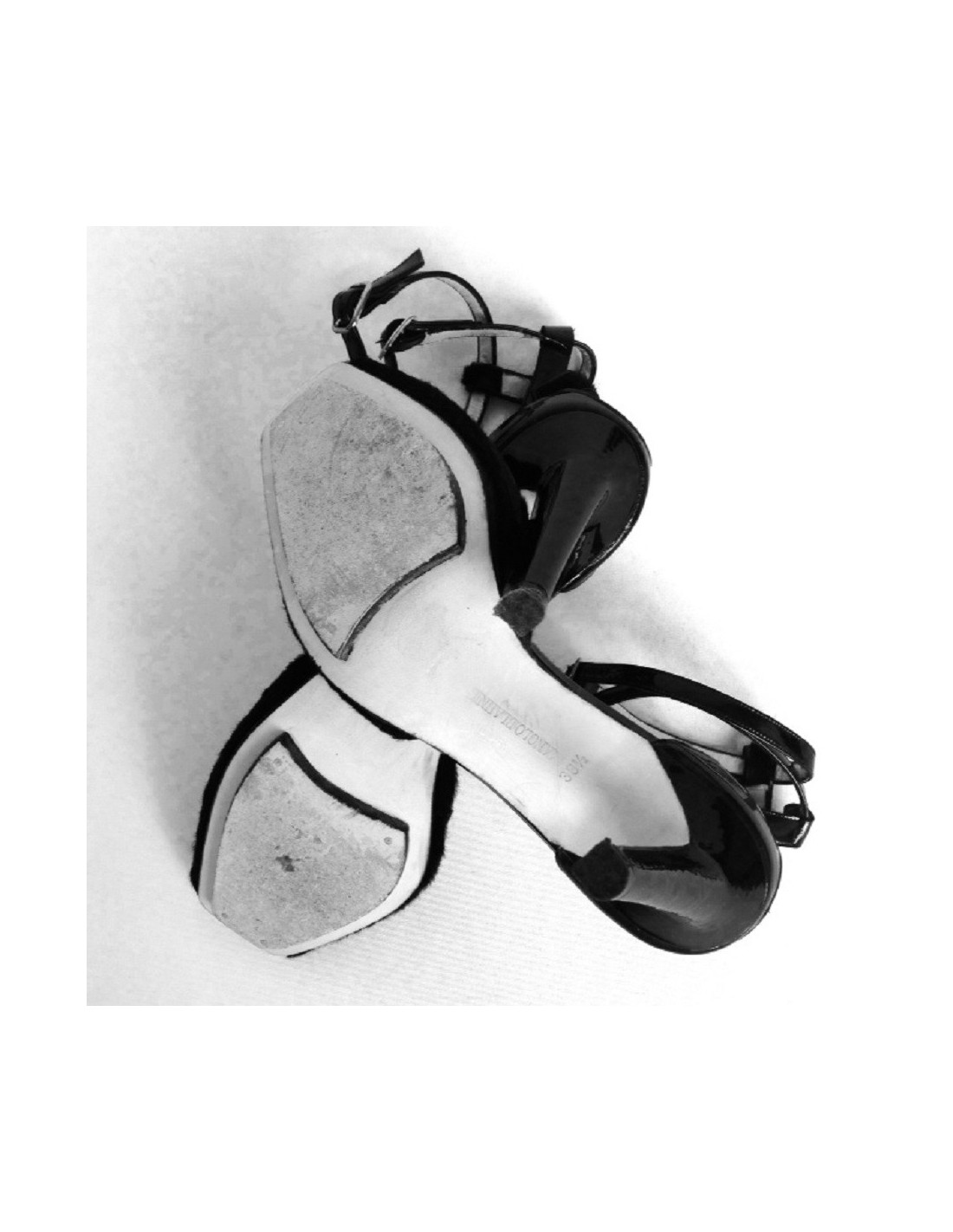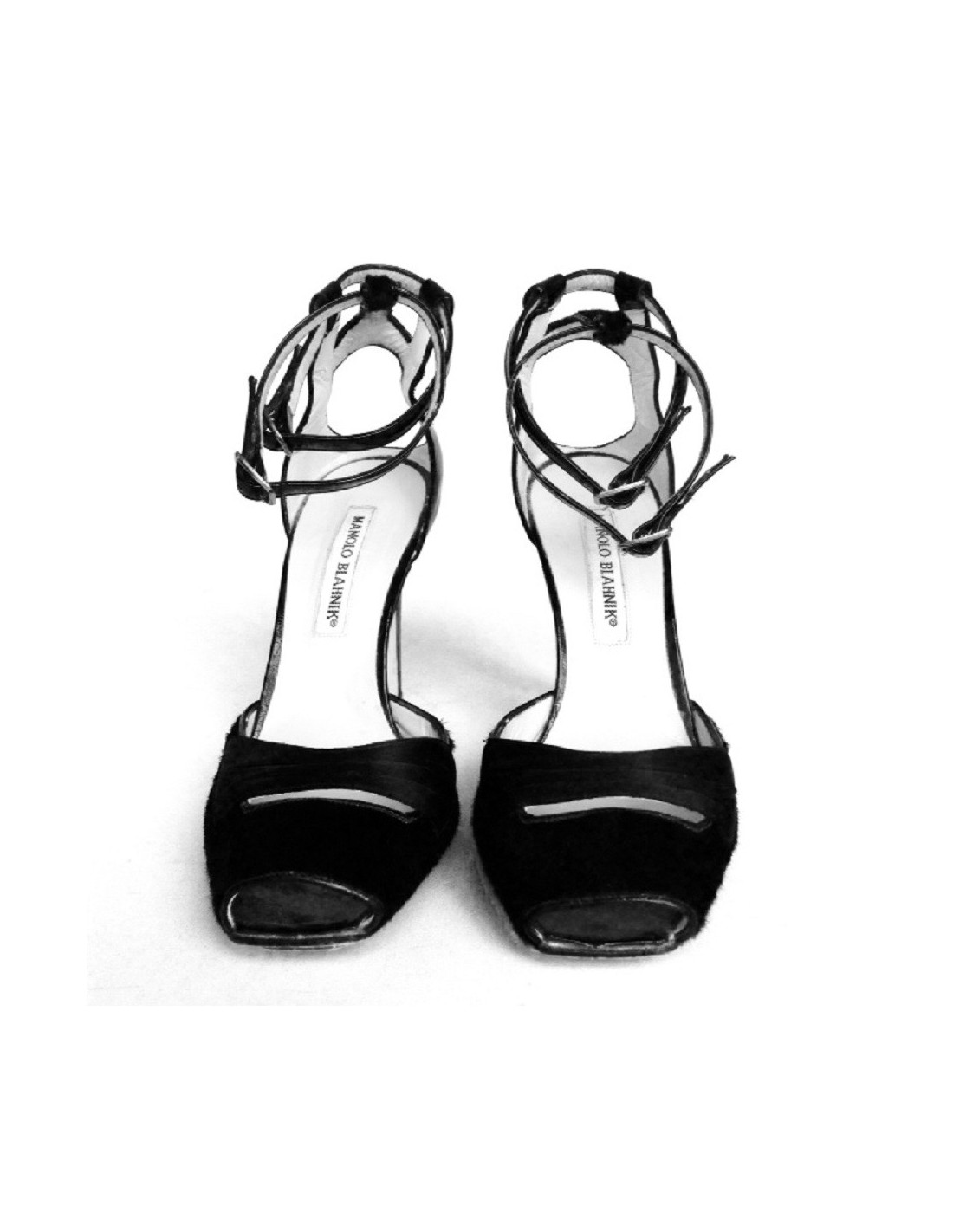 Escarpins noir Manolo Blahnik T 38,5. Vous trouverez un patchwork de trois matières différentes tels que: le satin, le cuir façon poulain et le cuir verni.