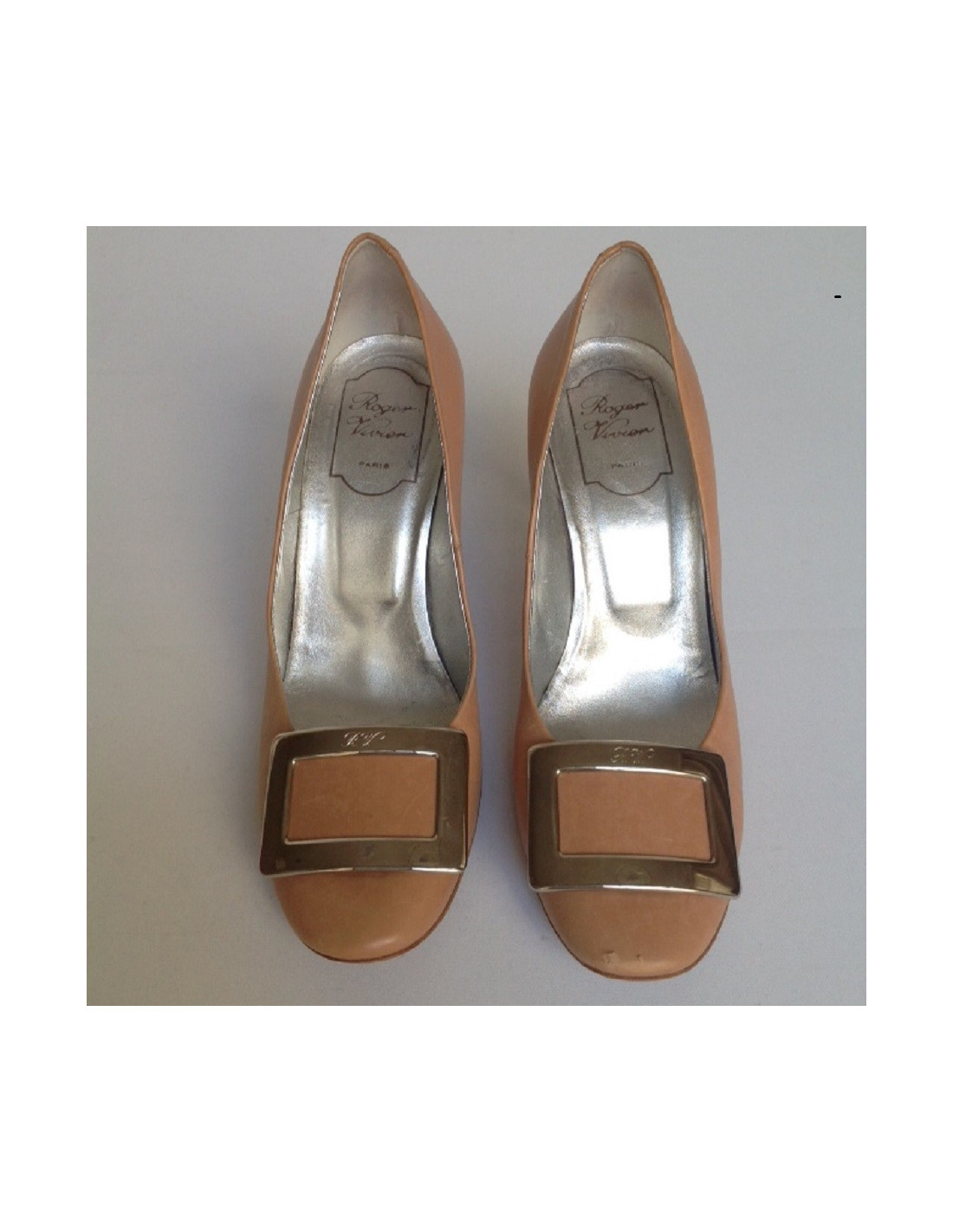 Escarpins en cuir lisse de couleur pèche de la marque Roger Vivier T 38. À l'avant de la chaussure un gros rectangle en métal argenté avec les initiales de la marque R.V. Le talon est en métal argenté brillant. L'intérieur de la chaussure est argenté.En bon état.( Sur le devant de la chaussure, une égratignure sur le cuir. )