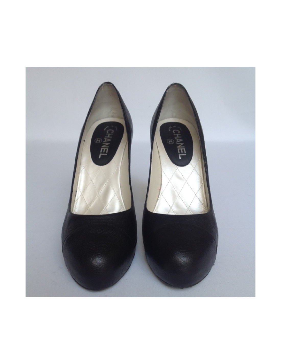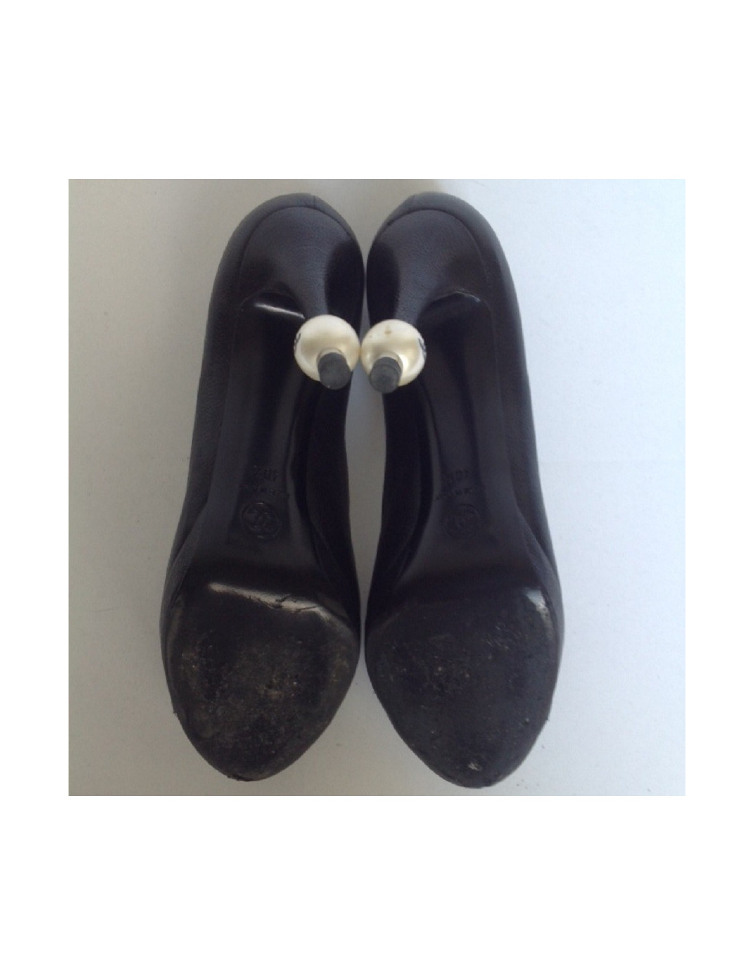 Escarpins en cuir noir Chanel T40,5 avec une perle en bas de chaque talon.