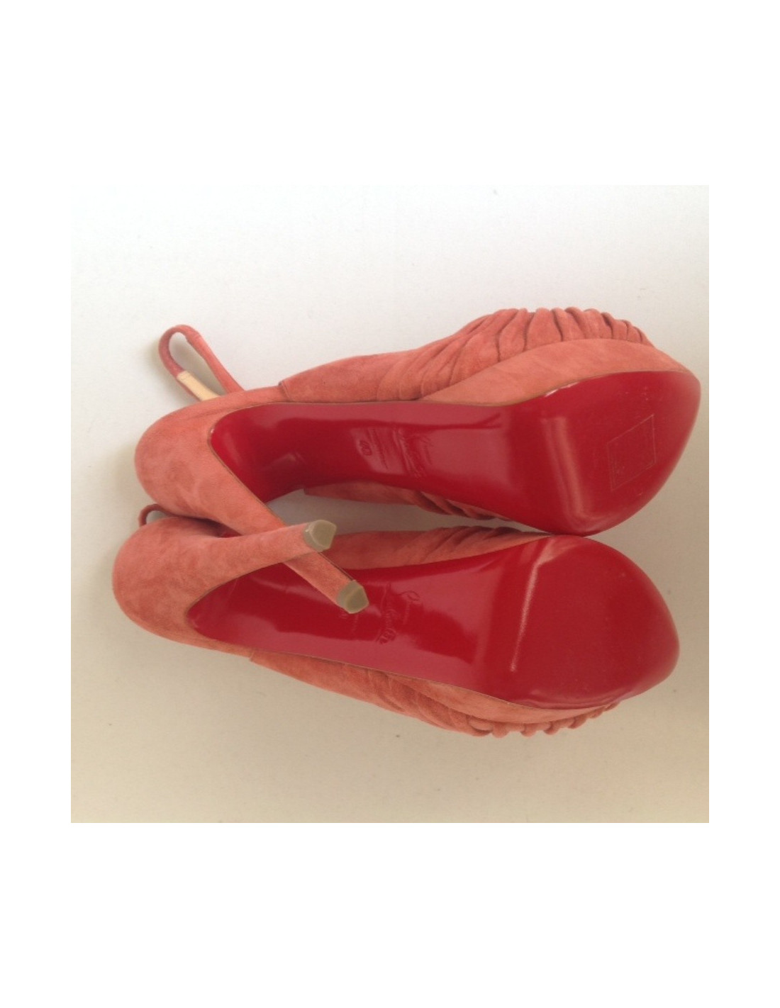 Magnifique paire de sandales hautes en daim couleur pêche Christian Louboutin T40 modèle 'Melle Gres Zeppa'. En excellent état.