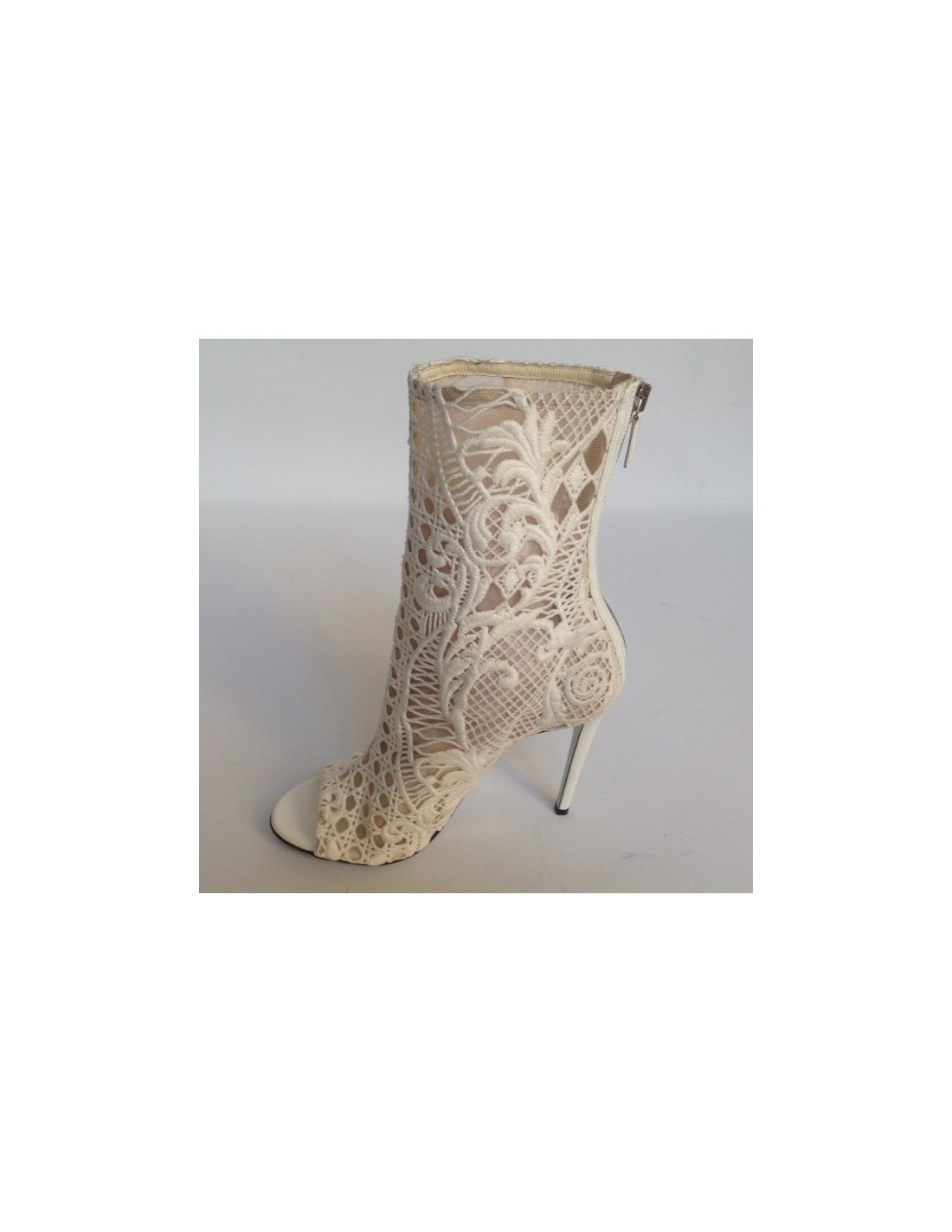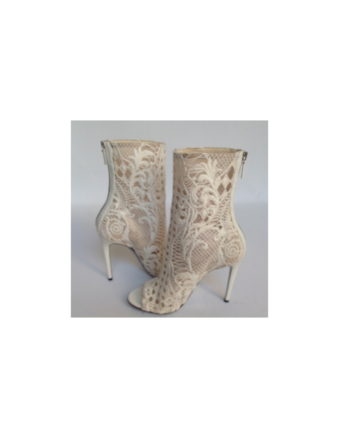 Bottines à talons, ouvertes à l'avant Balmain T39., très couture.Elles sont en dentelle couleur naturelle.Elles se ferment à l'aide d'un zip en métal argenté à l'arrière de la chaussure. Le talon est en cuir verni.Collection été 2013. Prix public + de 1300 euros.