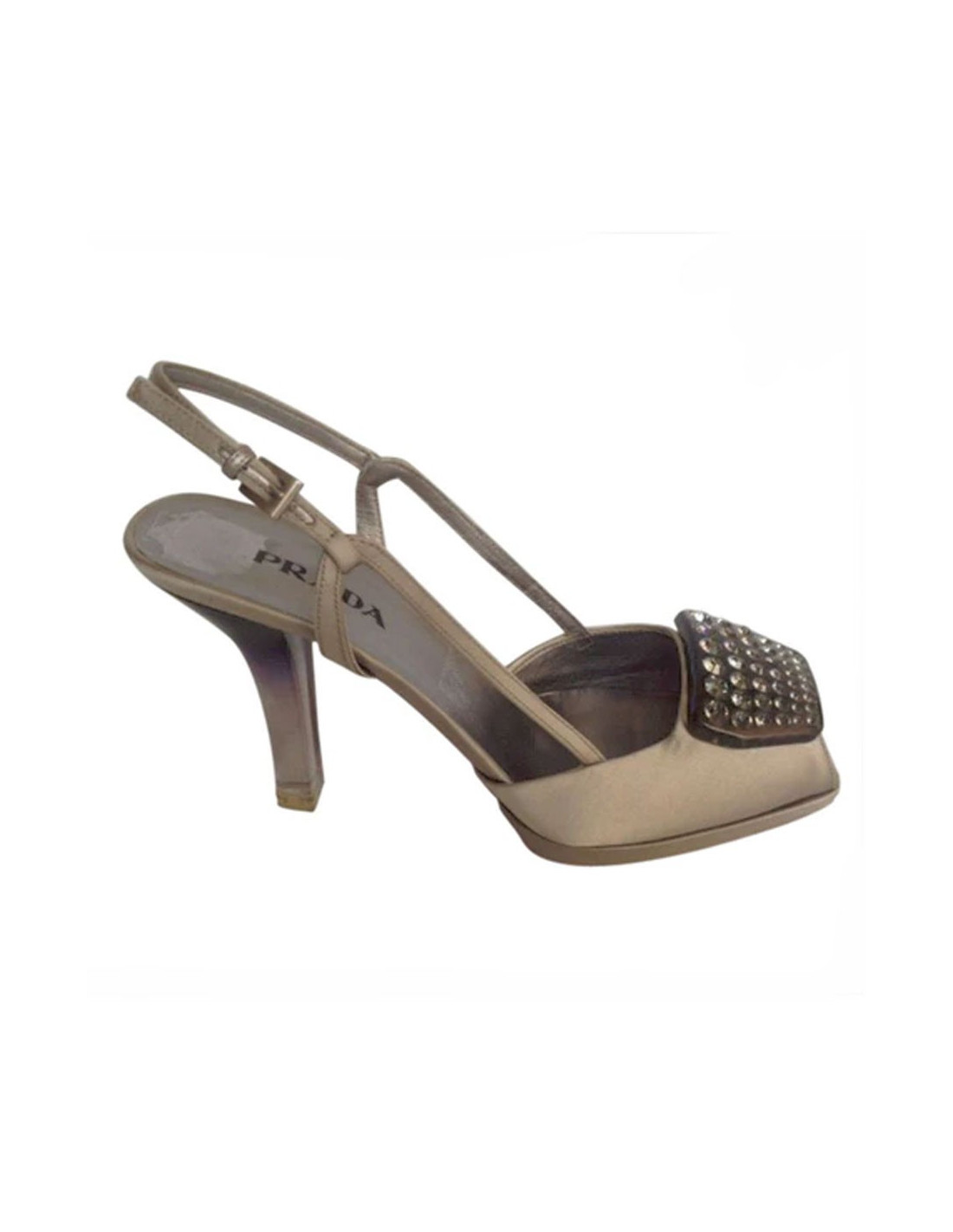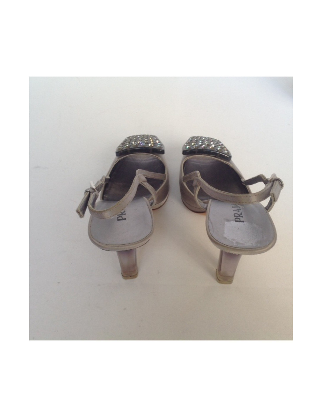 Très élégantes sandales hautes Prada grises, en satin duchesse et surmontées d'un bijou en brillants swarovski.