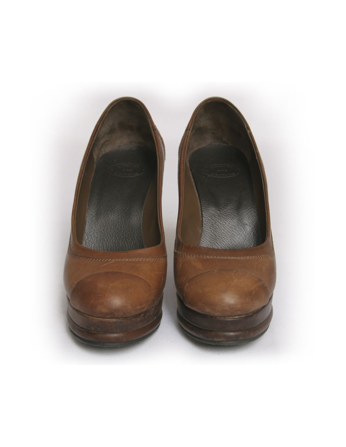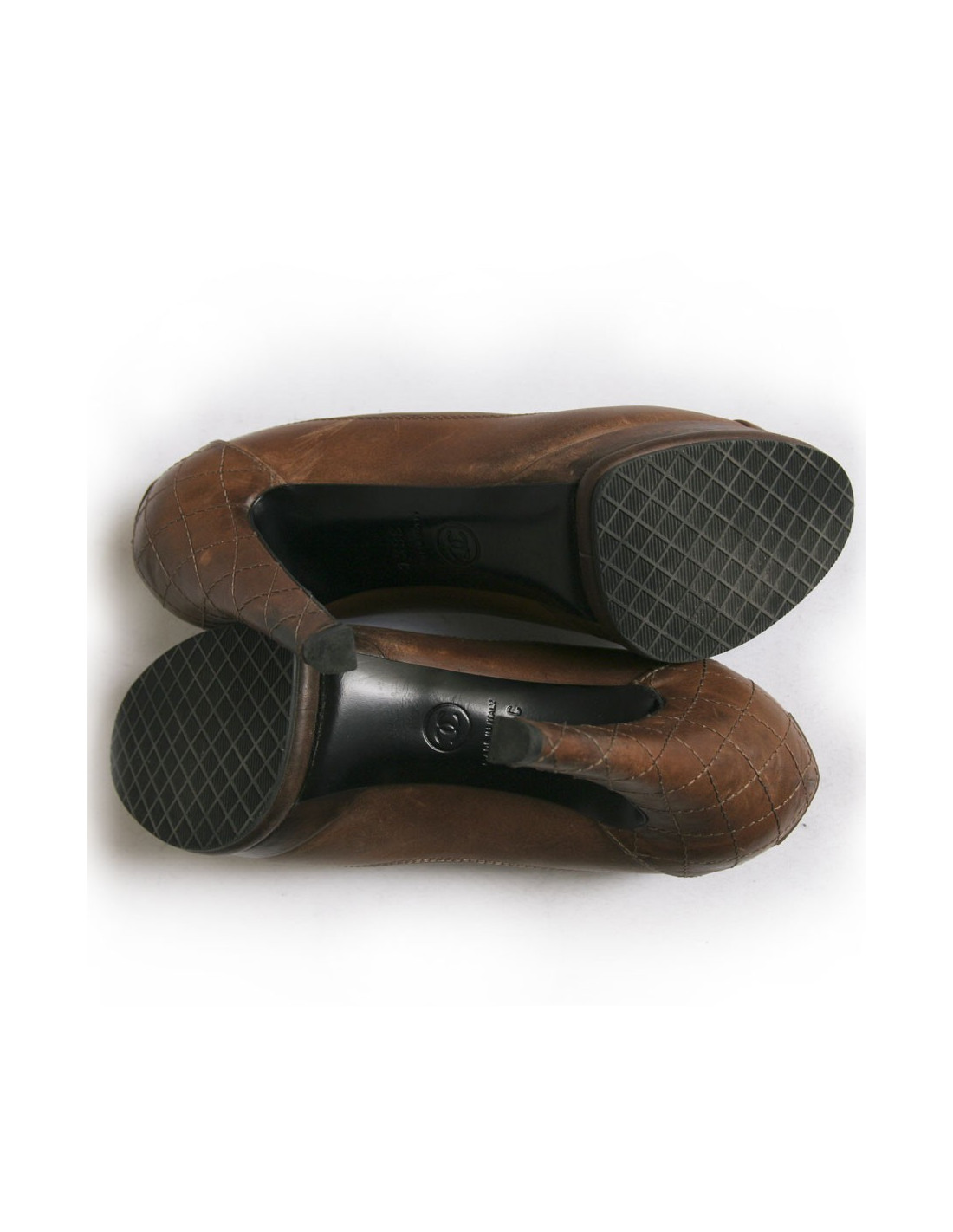 Paire d'escarpins Chanel en cuir havane. Taille 36,5. Surpiqures, effet matelassé sur le talon de la chaussure. Inscription "Chanel" à l'arrière. En bon état. Légères marques d'usures sur l'avant ainsi que sur le talon. La semelle sous le talon est légèrement décollé. voir photos.