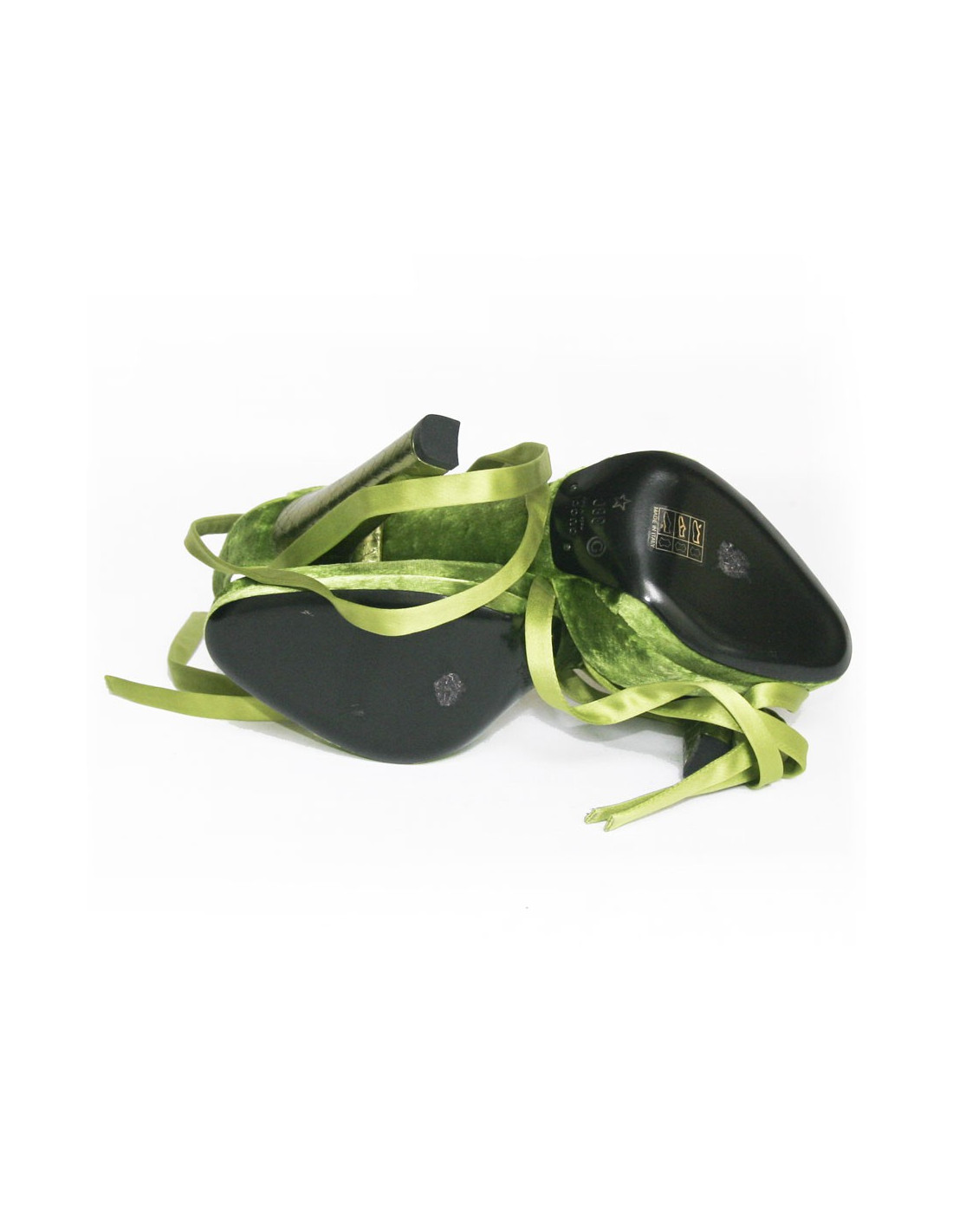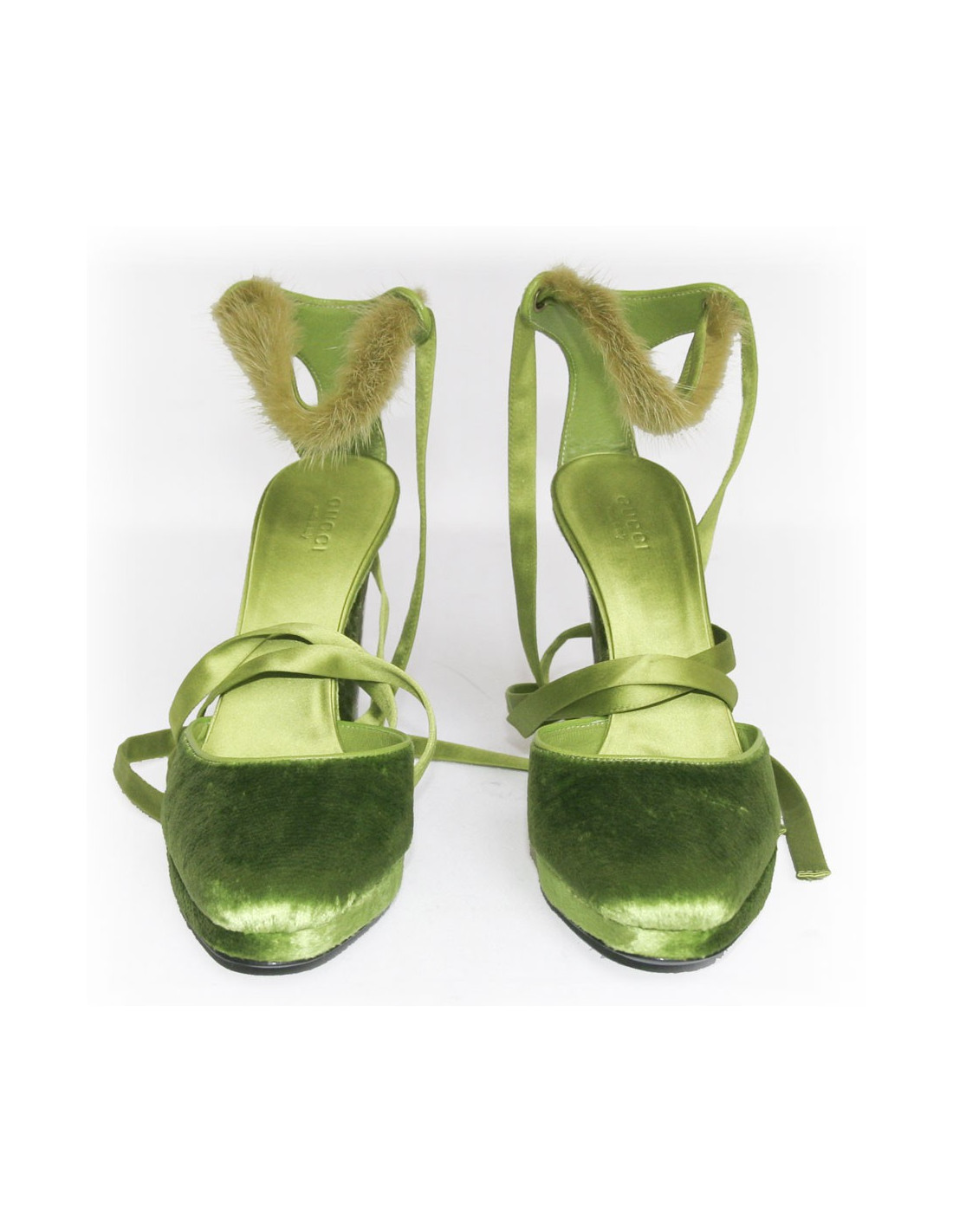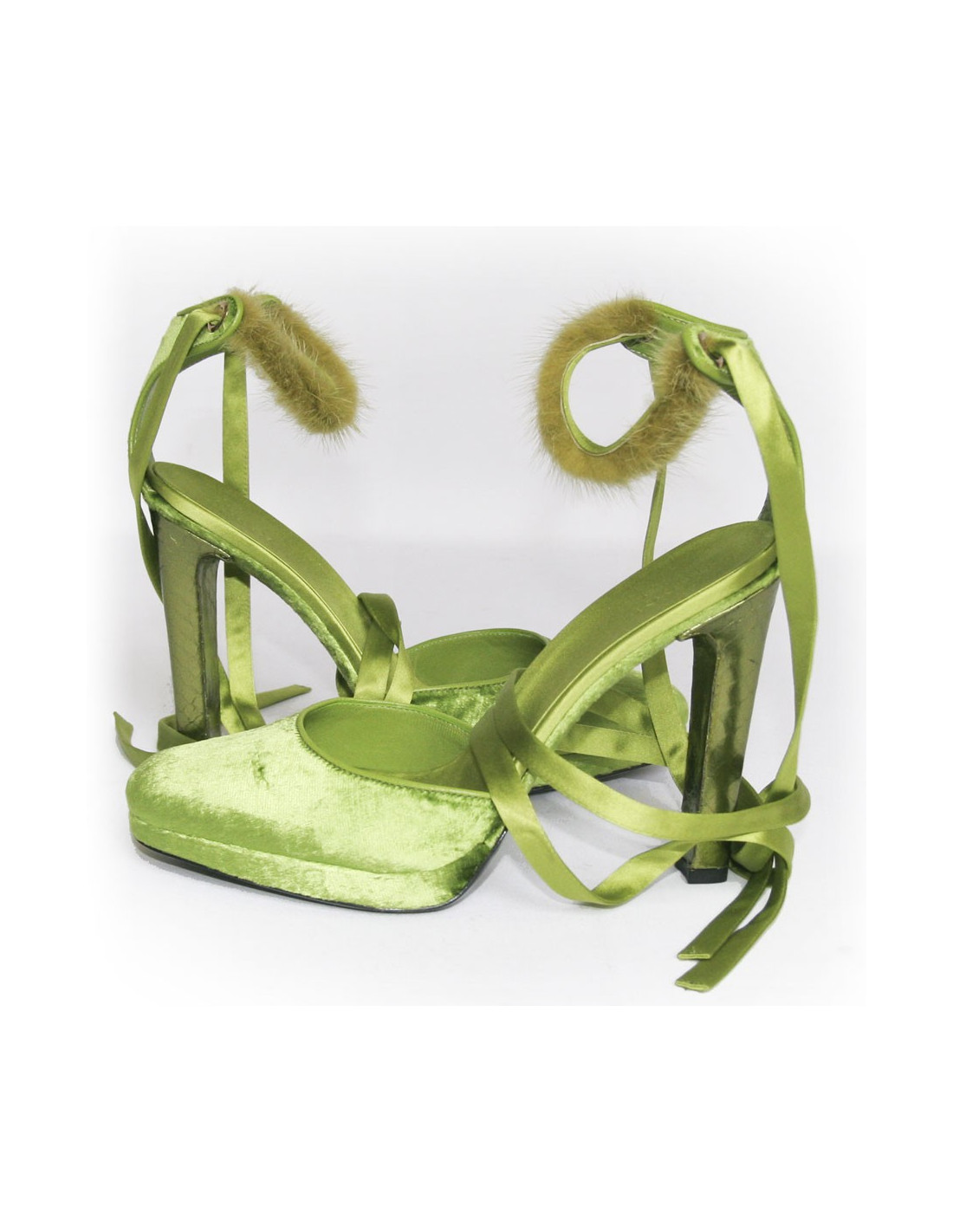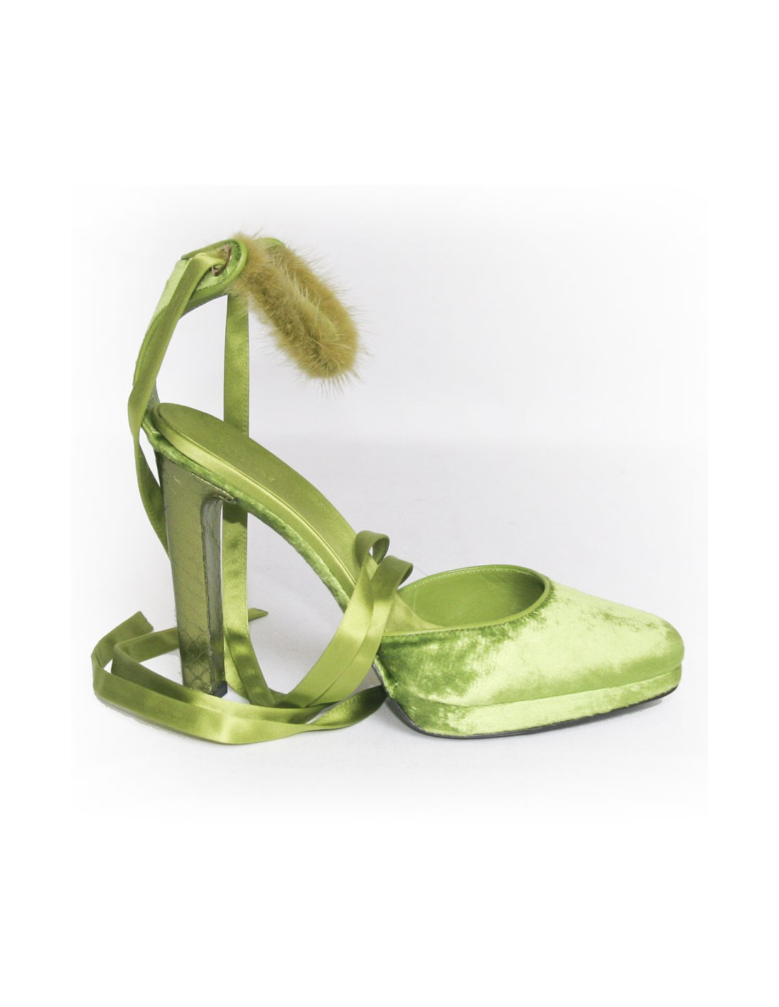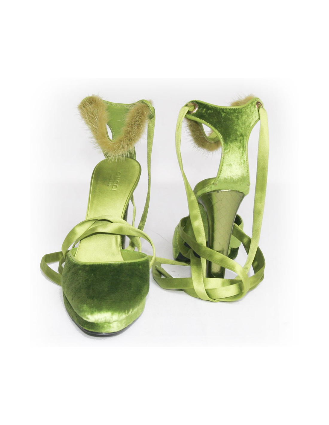 Sandale Gucci par Tom Ford en panne de velours vert . Taille 38. longue lanière en satin et vison vert se noue autour de la cheville. Semelle interieur en satin. Le talon est en python vert metallisé. Etat neuf.