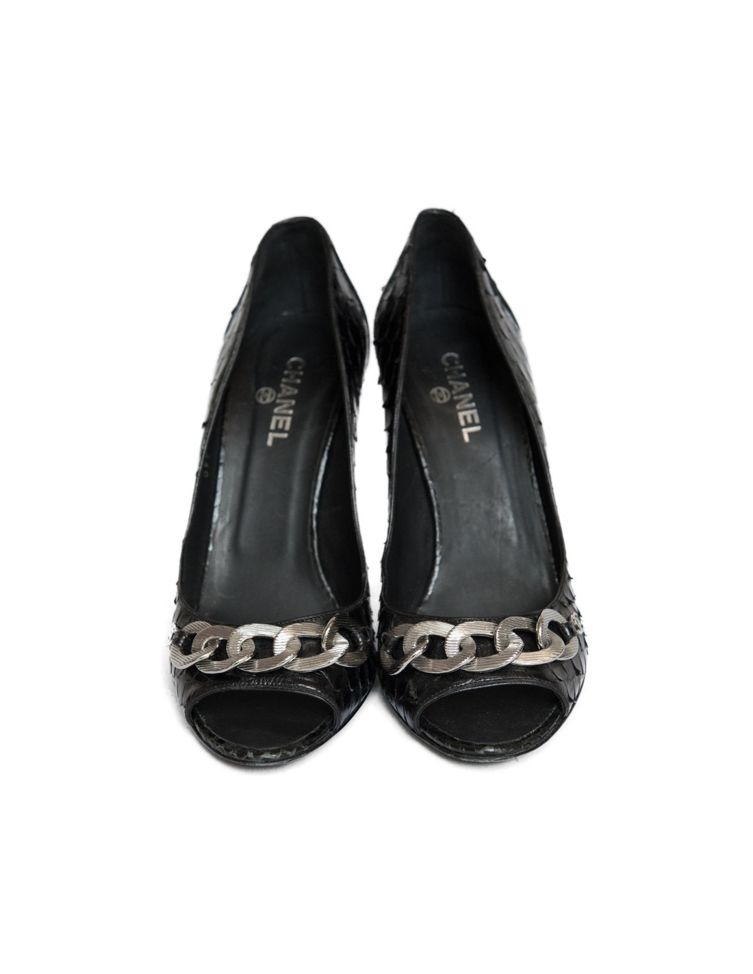 Paire d'escarpins Chanel en python noir. Taille 40,5. Chaine en métal argenté sur l'avant de la chaussure. En très bon état. Très légère usure du python à l'arrière des deux chaussures. Peu visible.