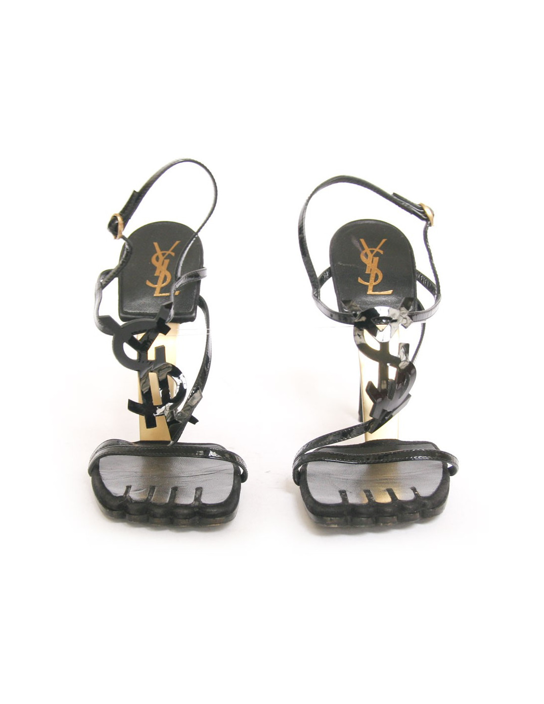 Sandales hautes Yves Saint Laurent avec des lanières en cuir verni noir pour tenir la cheville. Taille 39. Talons en tissu noir. Sigle "YSL" sur l'avant de la chaussure. En très bon état.