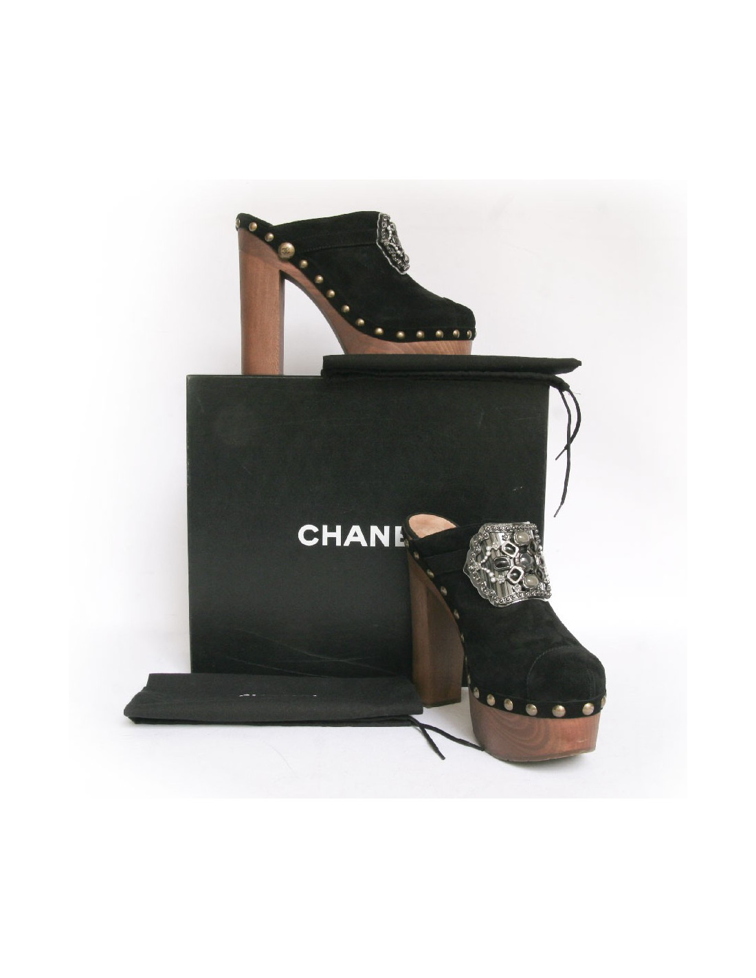 Mules en bois Chanel et en veau velours noir. Taille 41. Le talon et la semelle sont en bois. Elles sont agrémentées d'un bijou de couleurs noir, vert et argenté. En très bon état. Prix public 1800 euros.