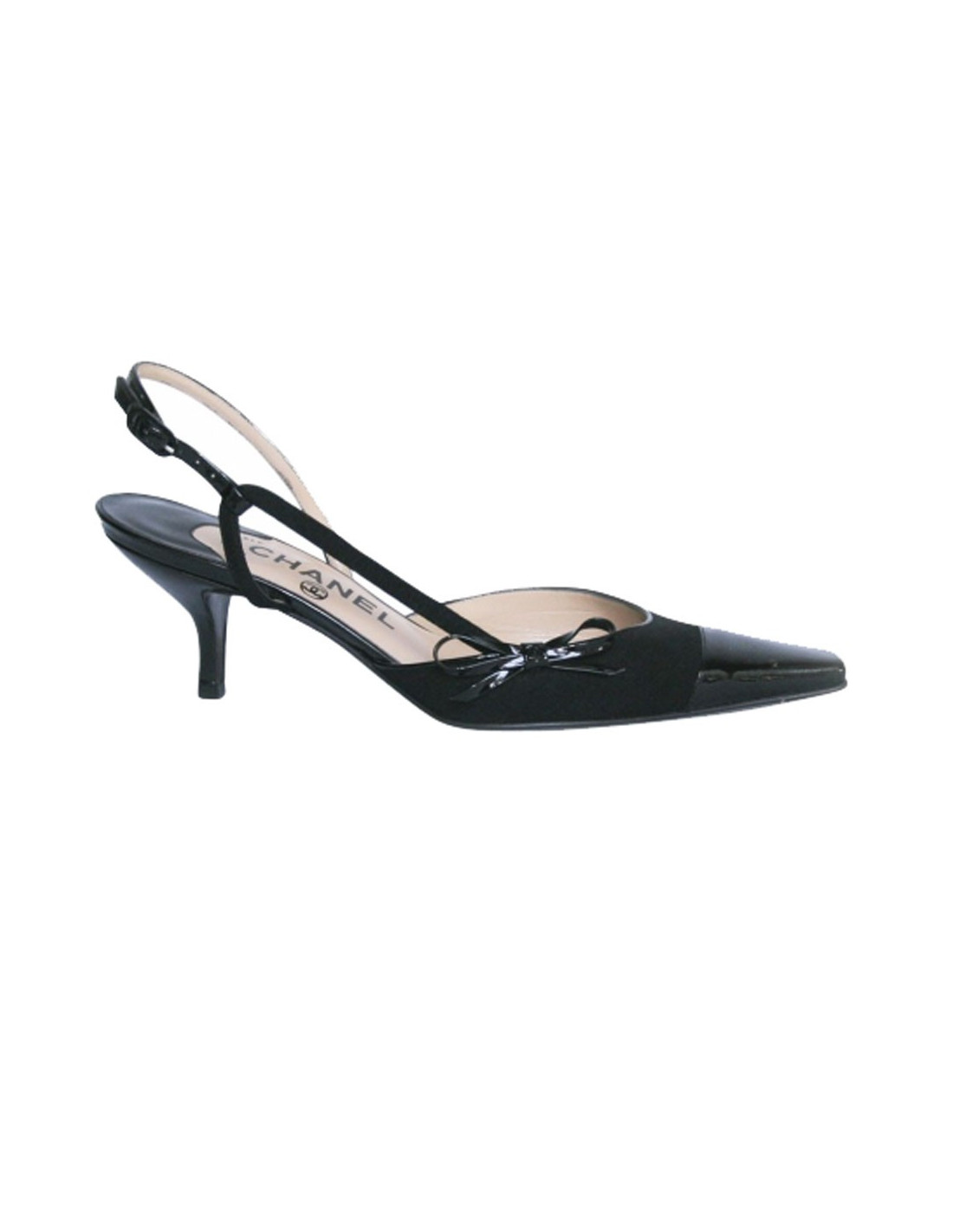 Escarpins Chanel en tissu et cuir verni noir. Taille 36,5. Un noeud en cuir verni noir se trouve sur le côté de chaque chaussure avec le sigle "CC" au centre.