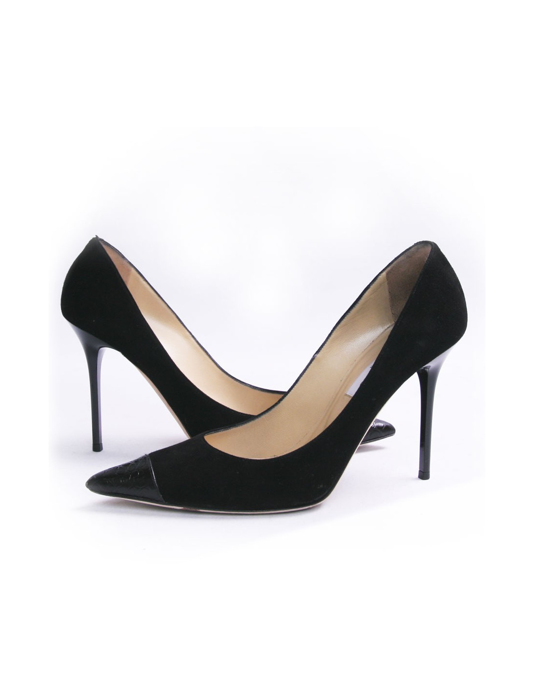 Magnifique paire d'escarpins Jimmy Choo en veau velours noir et cuir imitation croco. Bout pointu. Talon verni noir. Taille 38,5. En très bon état. Le bout de la chaussure gauche est légèrement usé. Voir photos.