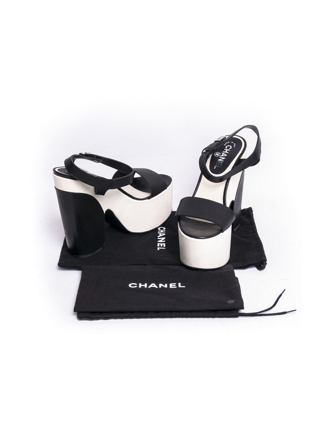 Sandales compensées T38 CHANEL bicolores ivoire et noir