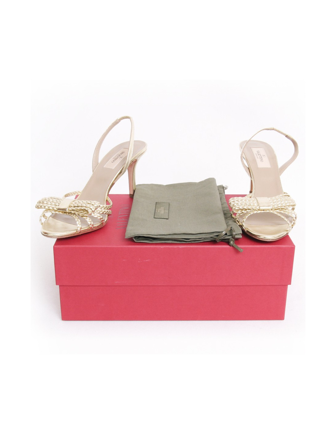 Ravissante paire de sandales hautes Valentino Garavani taille 39,5 couleur dorée. Plusieurs lanières tressées viennent former un joli noeud sur le devant de la chaussure, sangle élastique à l'arrière de la sandale. En très bon état.