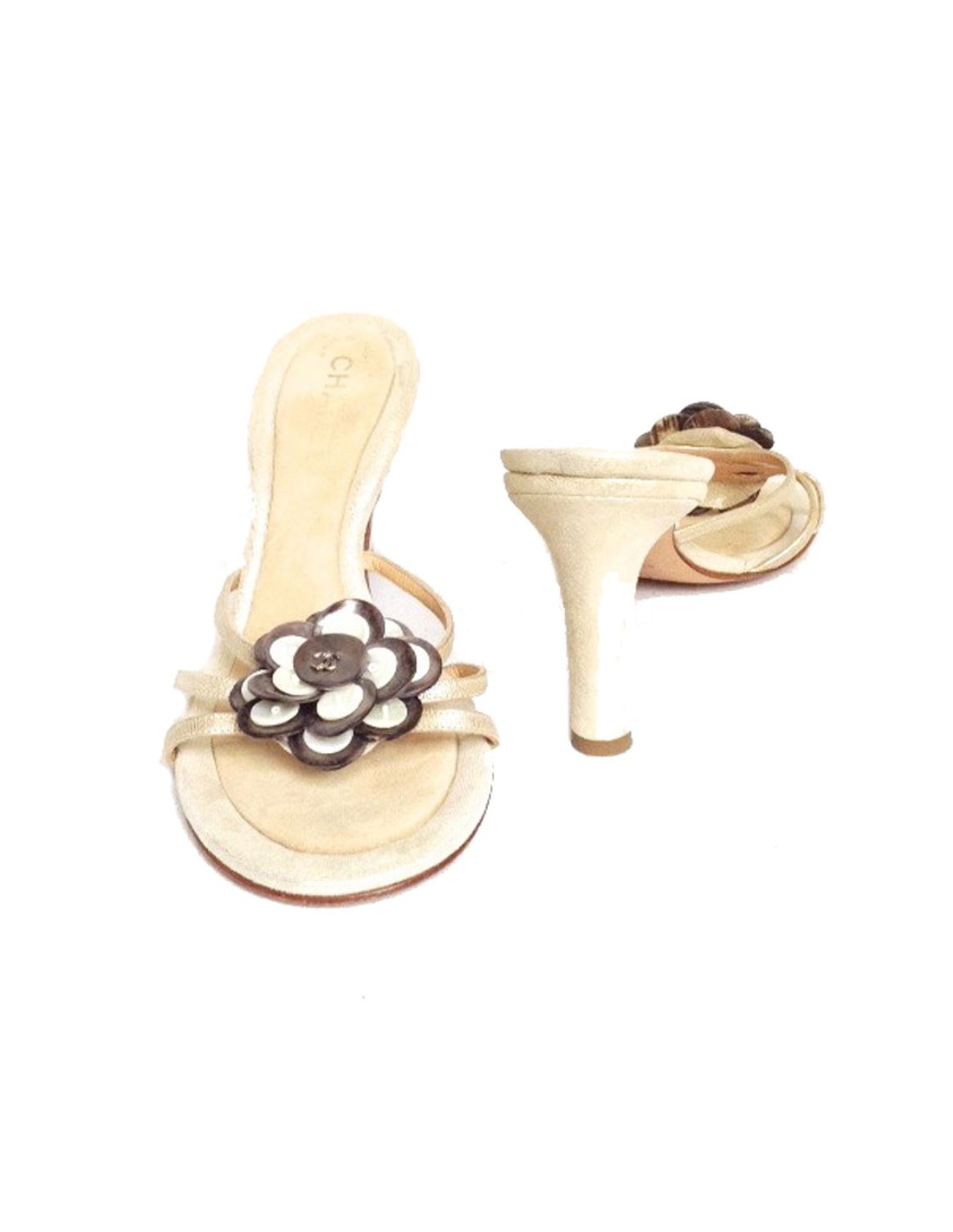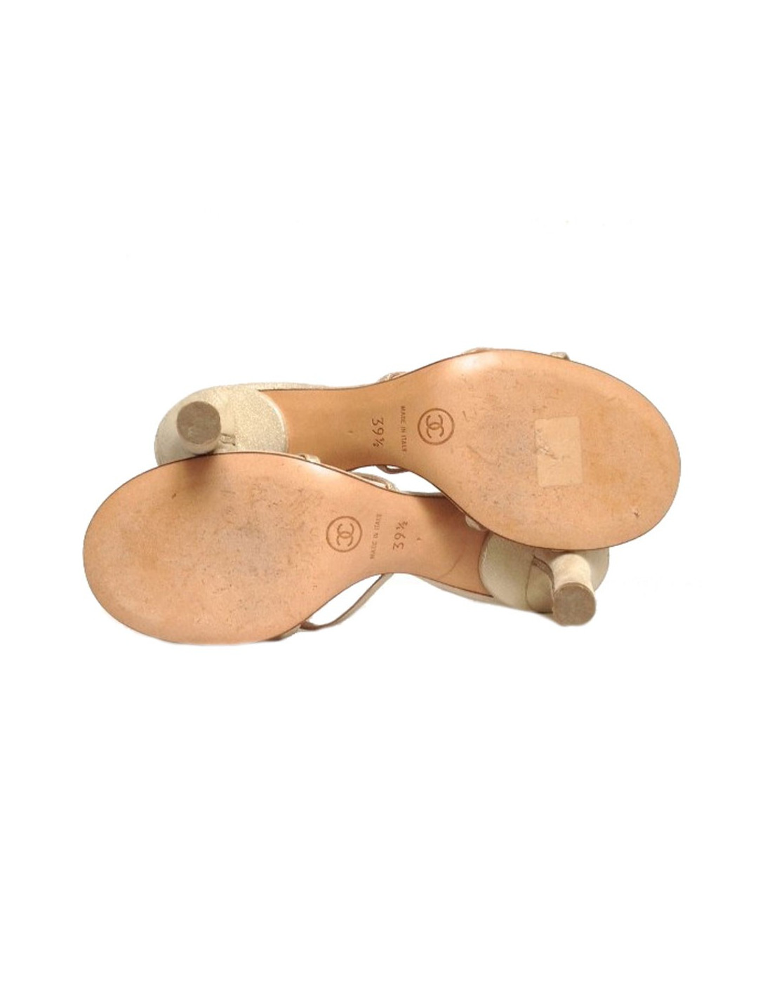 La semelle en daim molletonnée permet d'allier style et confort. La chaussure, simple et sophistiquée présente une bonne tenue du pied grâce à trois lanières de tissu en lamé doré de chaque côté du pied, se rejoignant à un assemblage de boutons en nacre gris, beige et et perles.