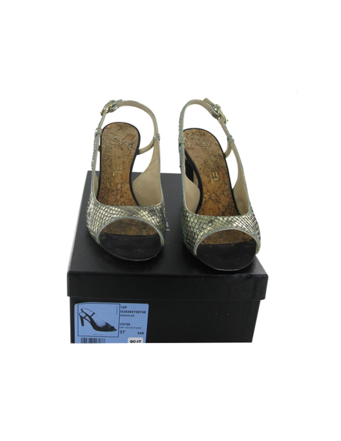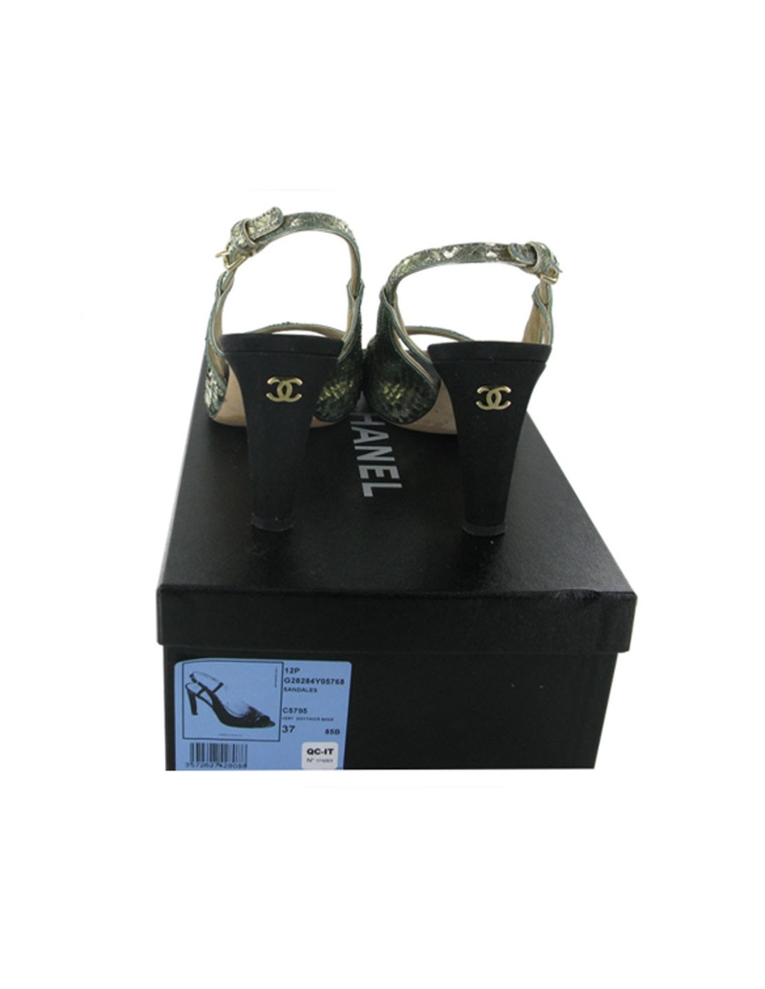 Sandales T 37 CHANEL en tissus facon python vert doré