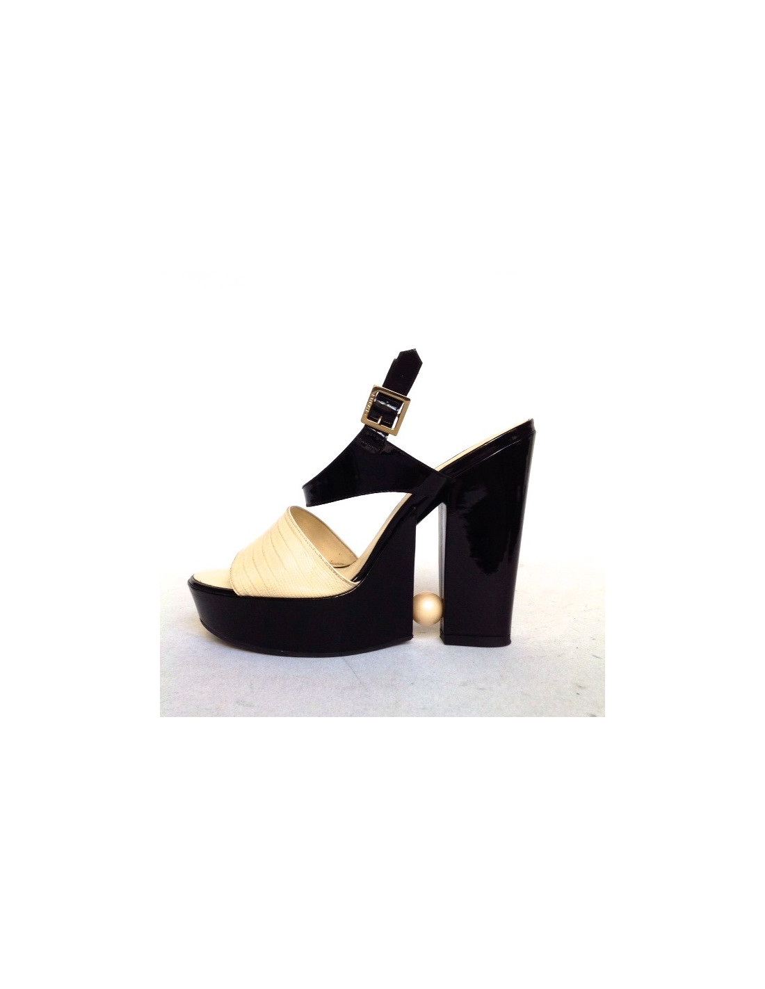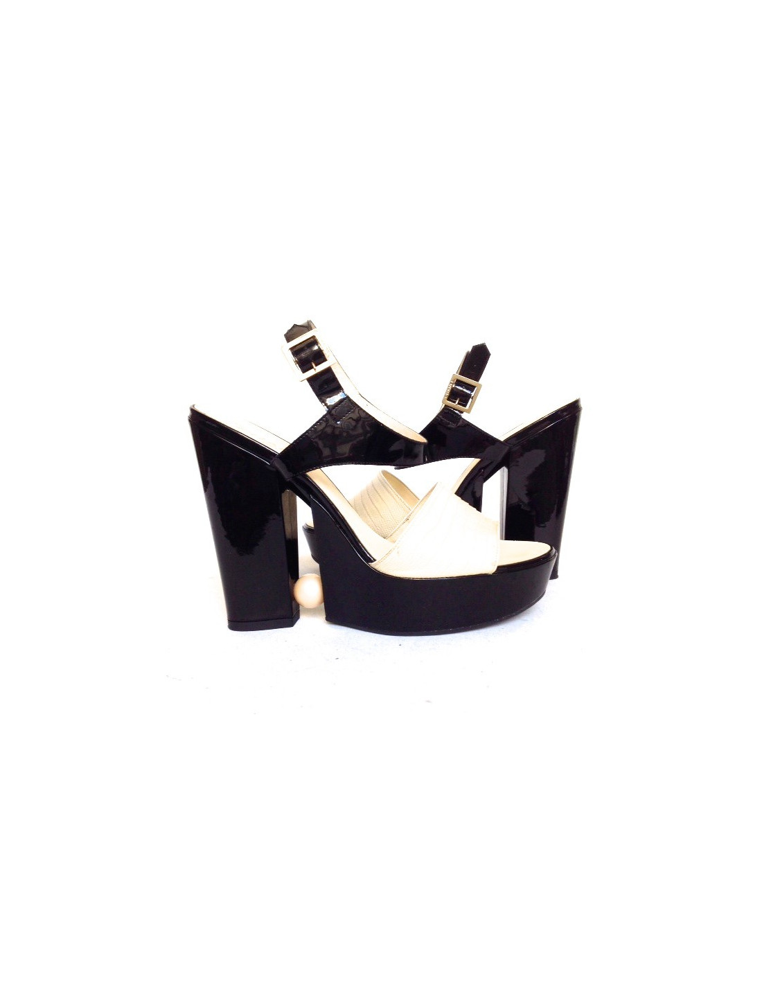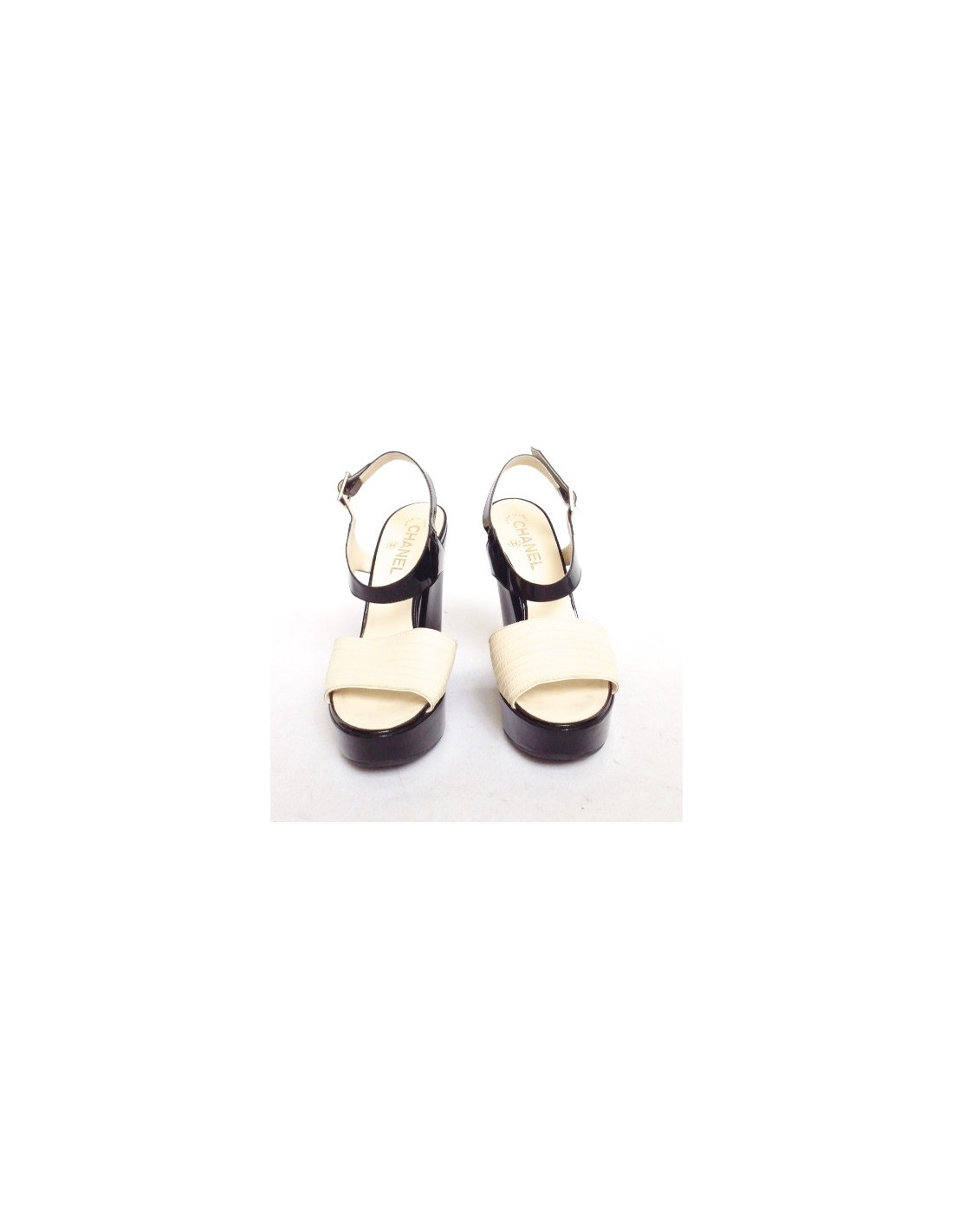 Sandales plateforme Chanel bicolores en cuir verni noir et python blanc taille 40.