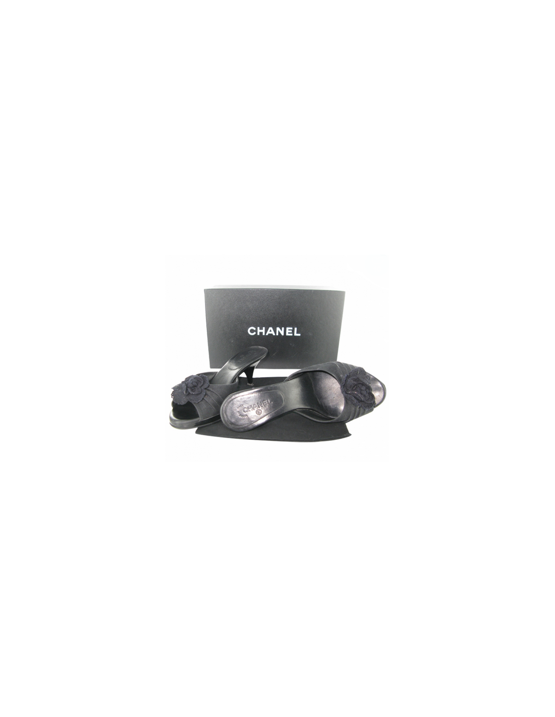 Mules mi-hautes T 36 CHANEL noires. L'extérieur et en lin, broche camélia en crochet. Un Logo est CC est un métal noir intérieur en cuir noir semelle gomme siglée CHANEL et matelassé . En bon état (légères égratignures sure le talon verni au devant de la chaussure, marques d'usure).