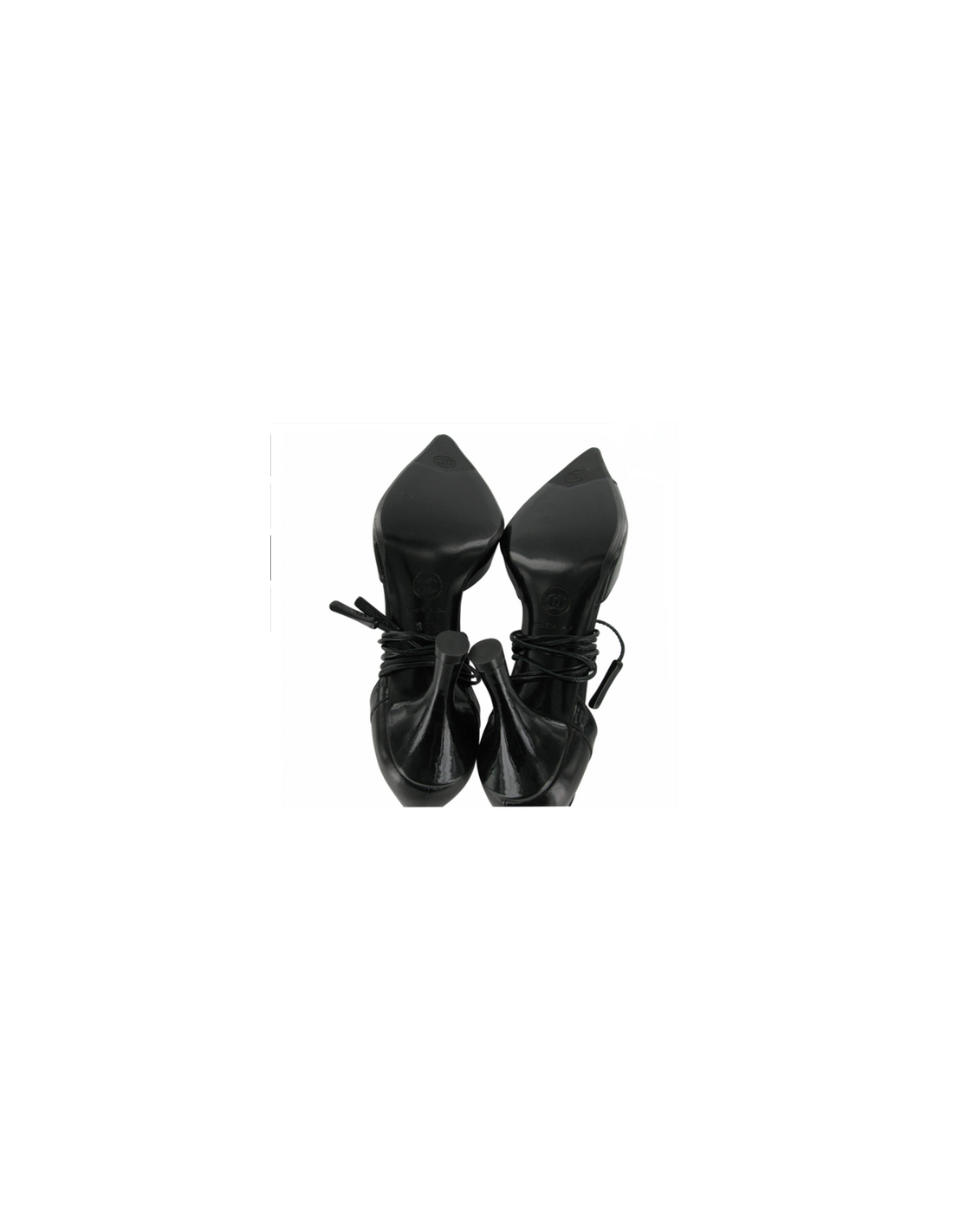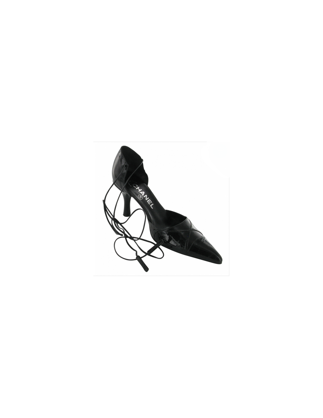 Escarpins CHANEL T 35.5 à lacets en cuir siglés Chanel sur une extrémité rectangulaire en plastique Forme géométrique sur le devant de la chaussures bi matière (cuir verni et cuir lisse ) .