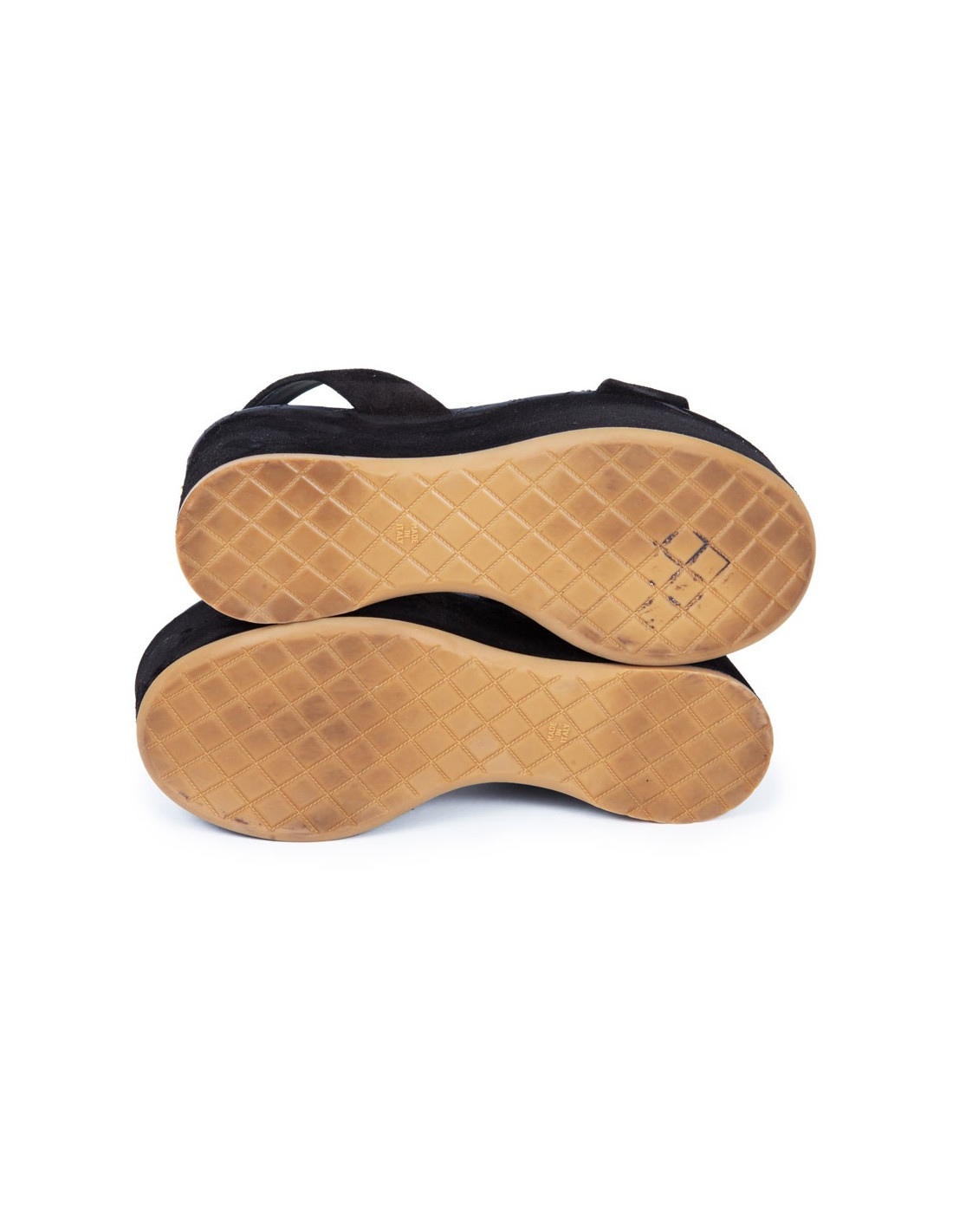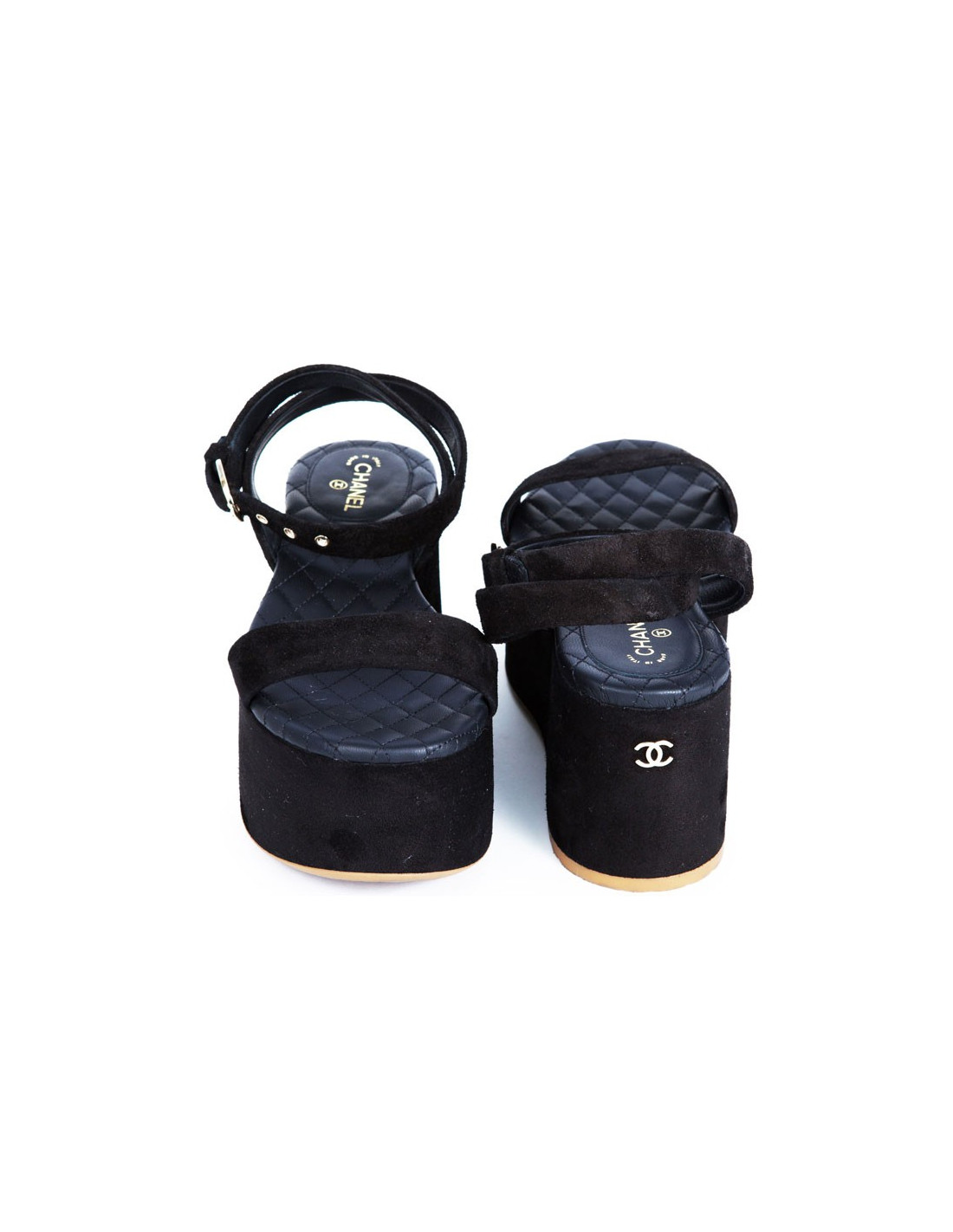 Superbe paire de sandales compensées de la Maison Chanel en veau velours noir en taille 36,5. Les semelles de ces chaussures sont en cuir, au vue de leur état, nous pouvons confirmer qu’elles n’ont été porté qu’une ou deux fois.