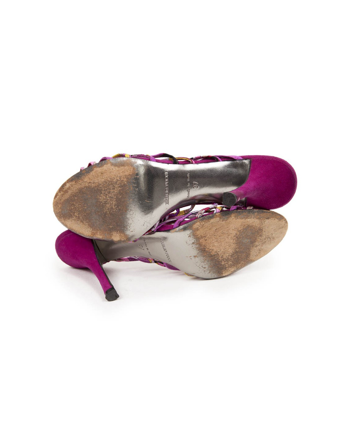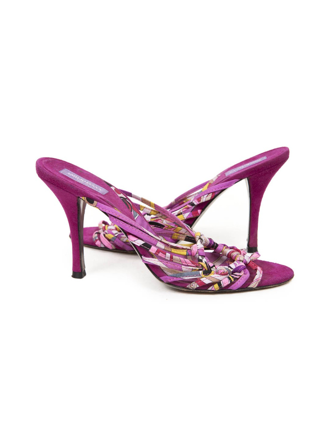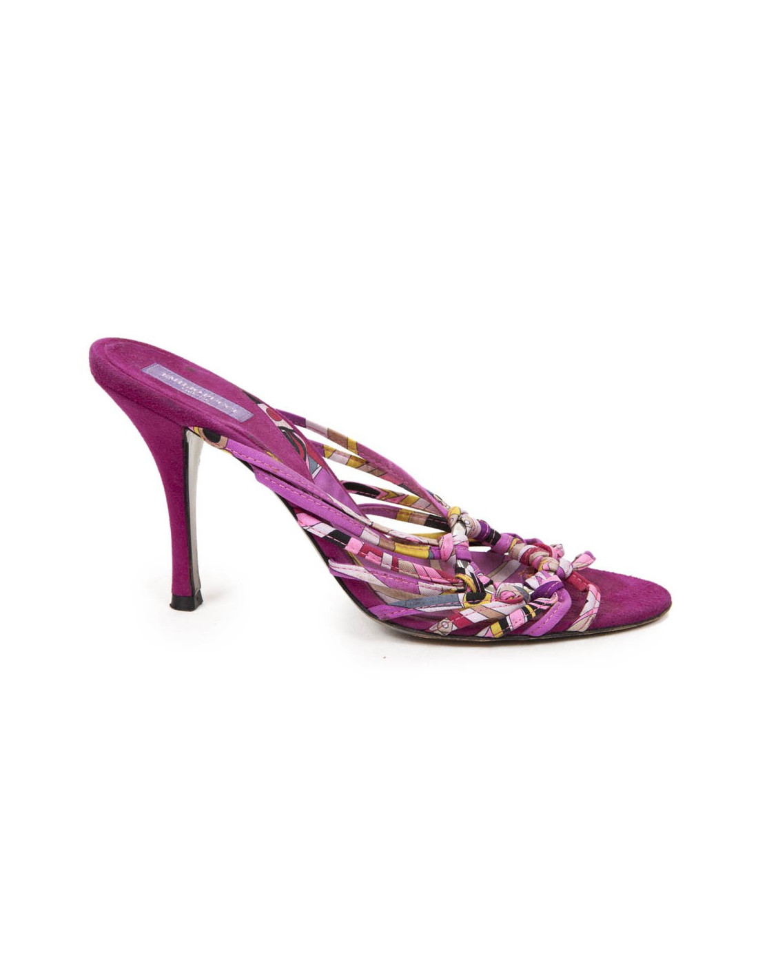 Sandales hautes T 37 Emilio Pucci en veau velours violet et pièces de foulard. pièce métallique argent palladié. En très bon état (sur le talon gauche un petit accroc)